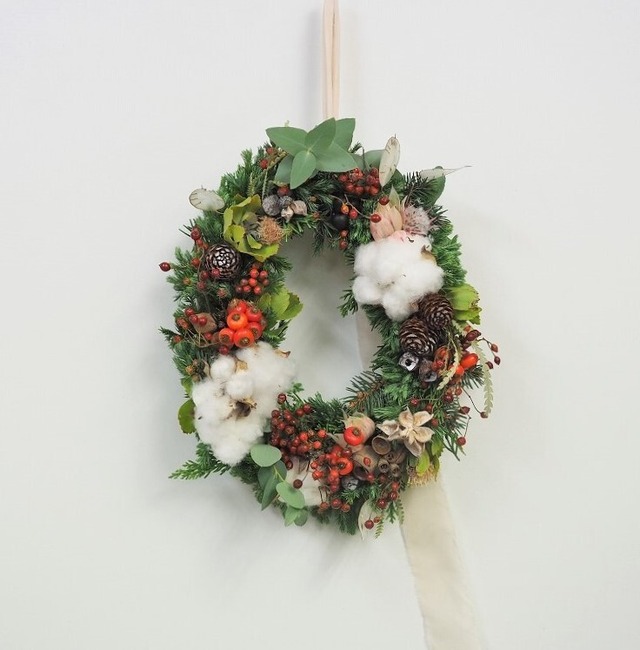 スギなどクリスマスっぽいリーフを使い、オーバルの形に作っています。 白いコットン・ルナリア・エリンジウム 実ものなどでつくった シックなクリスマスリースです。 生花とドライフラワーで作成していてそのまま全てドライフラワーになります。 リボンで壁に掛けて飾って頂けます。 size 約 横幅23cm✕縦28㎝(リボン含めた長さ縦63㎝) 全ての作品はセロファンでラッピングをして、お送りさせて頂きます。 作品が届き次第、すぐにご開封をお願いいたします。 ドライフラワーは湿気が多いところを避けて保管してください。 また光に長時間当たると色あせしますし、痛みやすくもなりますのでご注意下さい。 なるべく日の当たらないところに飾って楽しんで下さい。