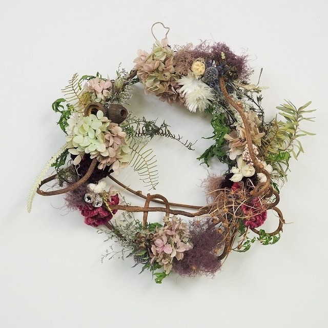 ドライフラワーのリースです。 色んな種類の実をたくさん使ってつくりました。 大きめのリースなので存在感があります。 壁に掛けて飾っていただけるように後ろにワイヤーがついています。 size 約 直径50cm セロファンでラッピングをして、お送りさせて頂きます。 作品が届き次第、すぐにご開封をお願いいたします。 ドライフラワーは湿気が多いところを避けて保管してください。 また光に長時間当たると色あせし、痛みやすくもなりますのでご注意下さい。 なるべく日の当たらないところに飾って楽しんで下さい。 ご来店でのお引き取りをご希望の方は、お店の方へ直接お電話・FAX・ご来店の上、ご注文ください。 ご不明な点やお急ぎのご用件がございましたら、営業時間内に店舗までお電話くださいませ。 ローブリーク TEL 086-221-3425 営業時間 11:00~18:00 定休日 火曜日・水曜日