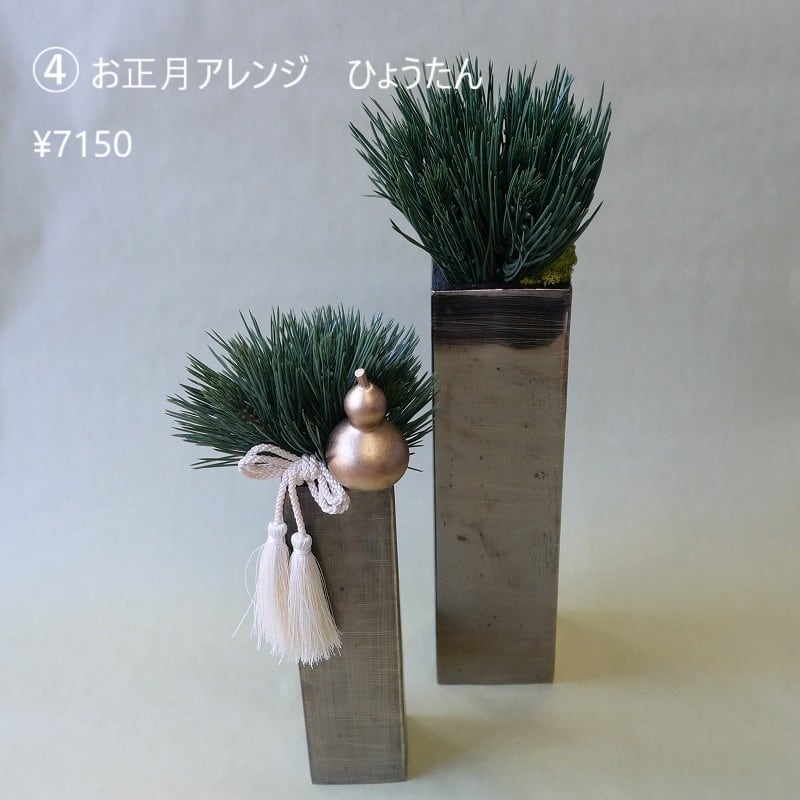 金属の器に造花の松やひょうたんを使ってお作りしています。