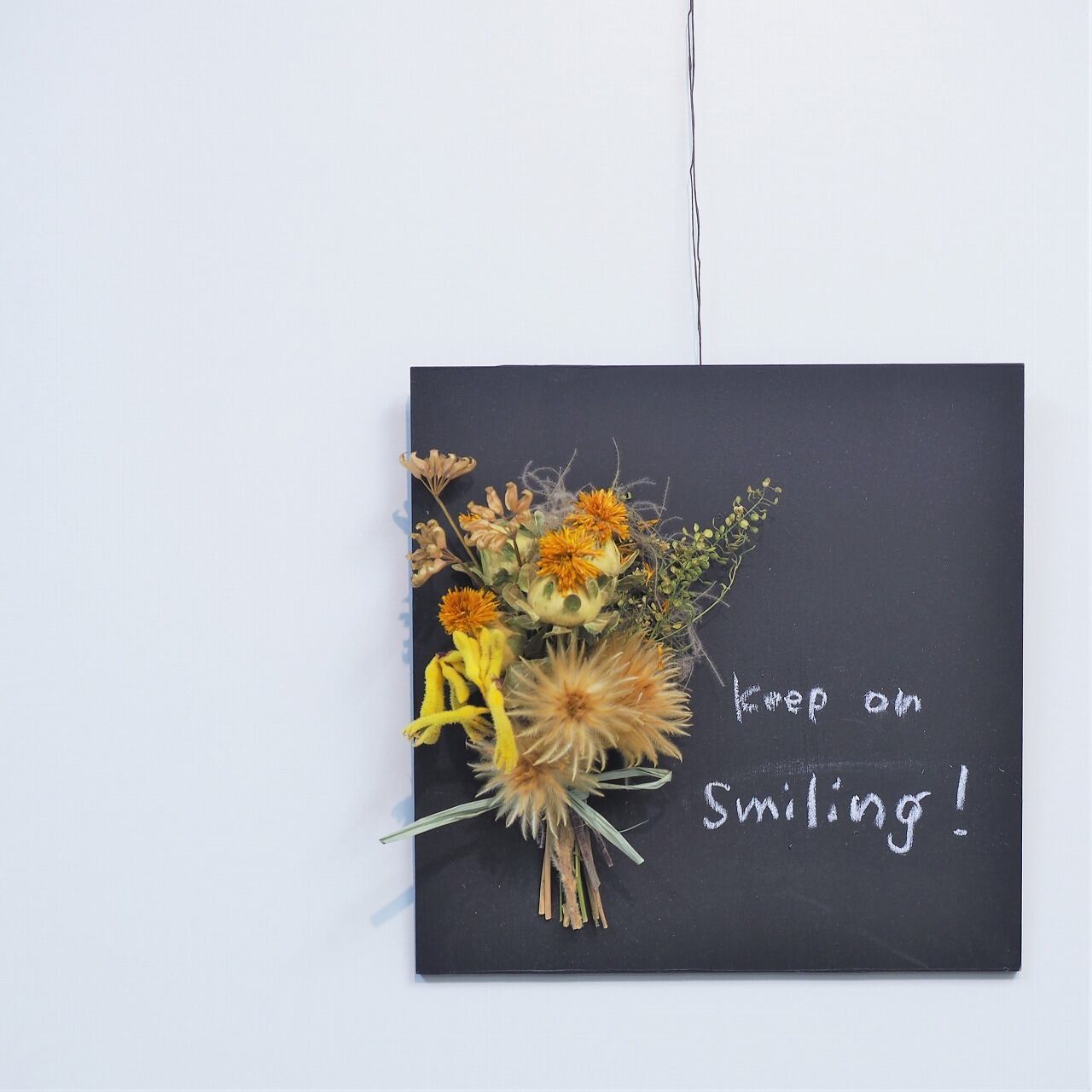 黒板にドライフラワーのミニブーケをつけてみました。