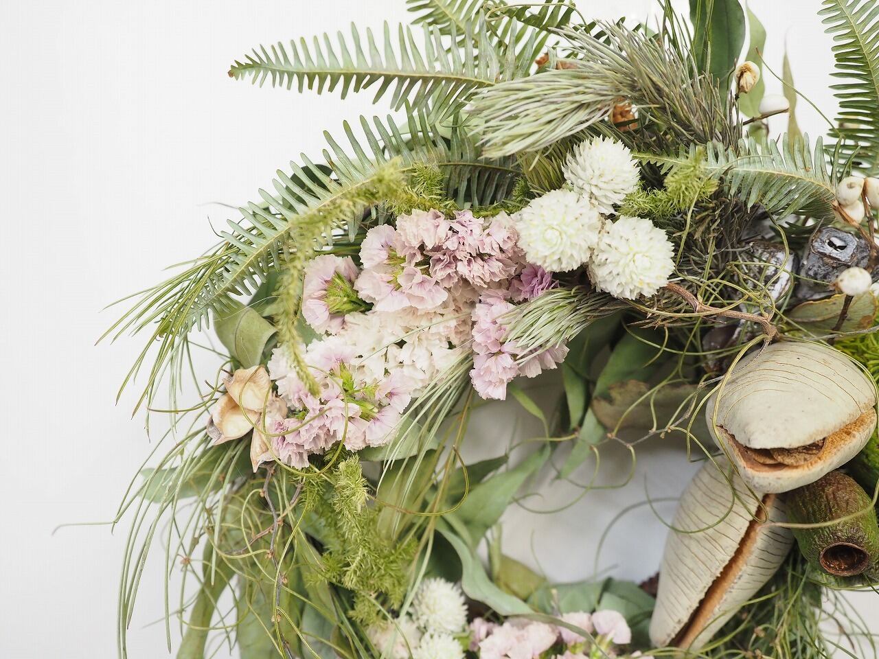 ウッディペアの実・スターチスのピンク・センニチコウ・グリーンのリーフでふわっと春の軽やかな雰囲気で作りました。全てドライフラワーです。