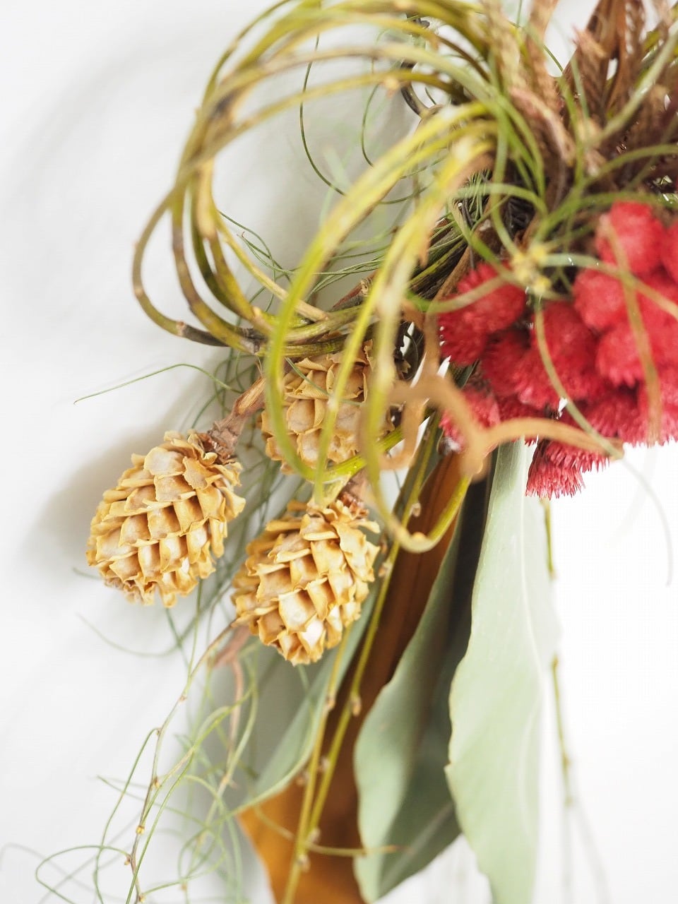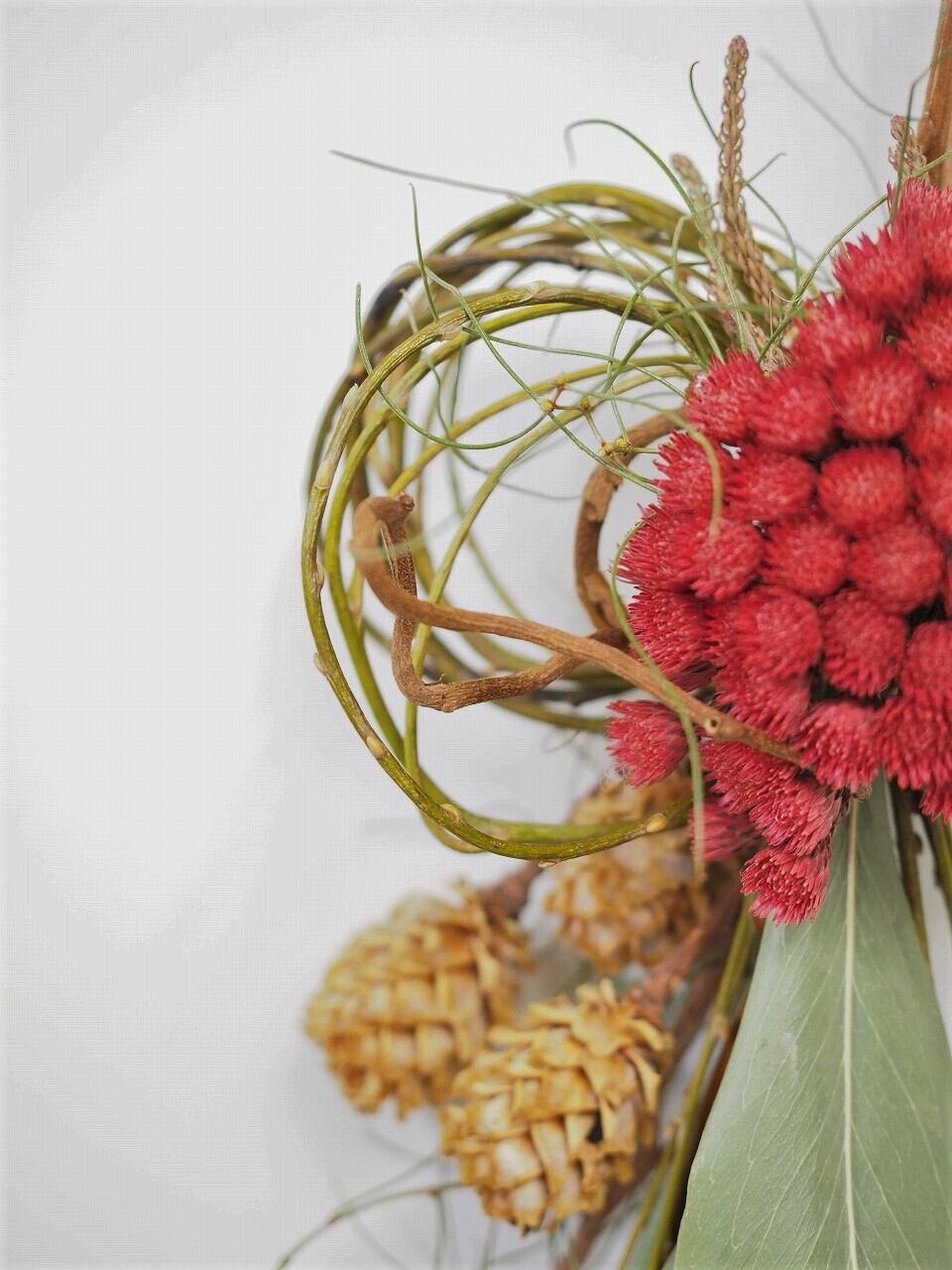 くるくる巻いた柳にアルビフローラ・マツボックリなどでスワッグ風につくりました。全てドライフラワーです。中心部の後ろに壁にかけれるようにワイヤーがついています。