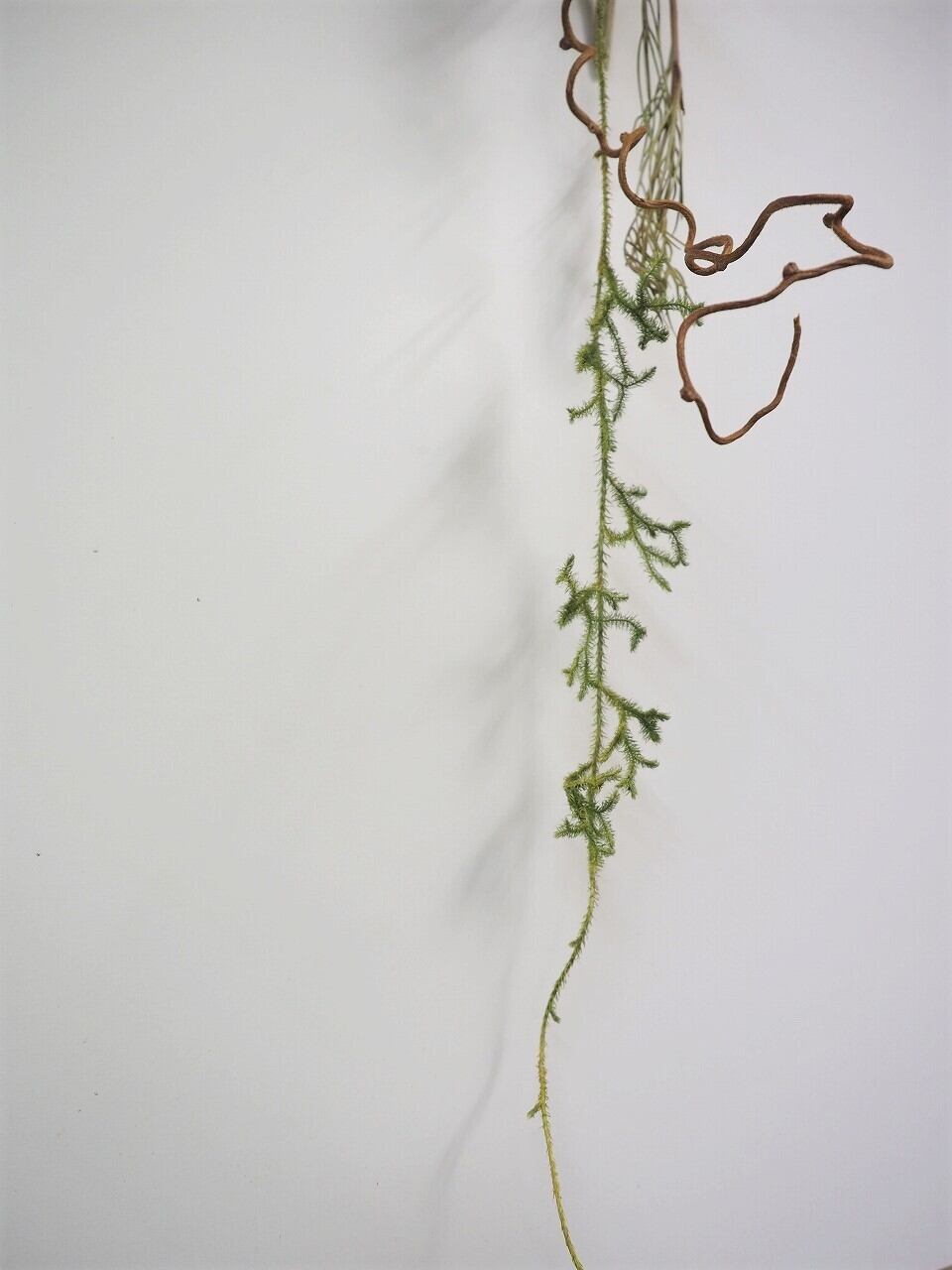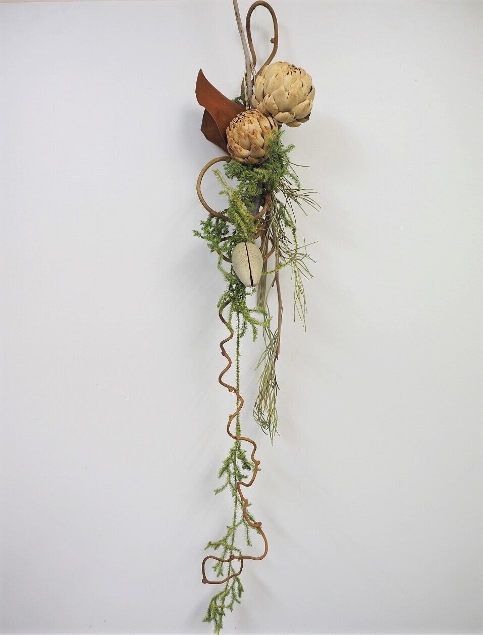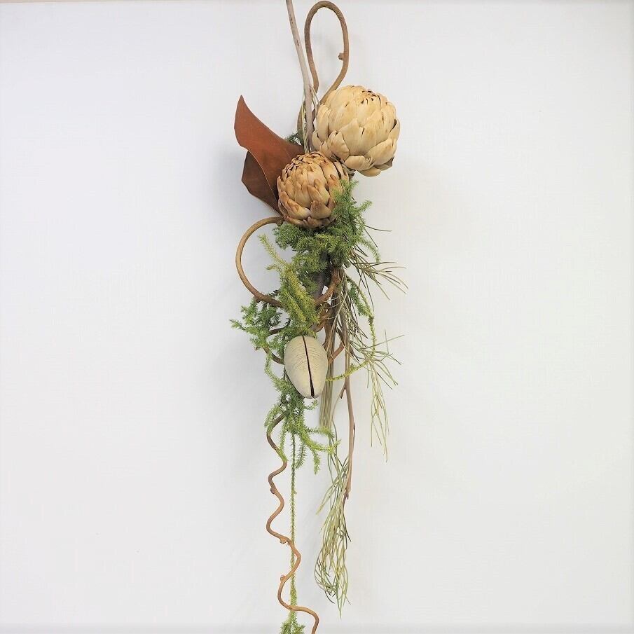 ドライフラワーのアーティチョークの蕾・ウッディペア・マグノリアにキウイのつる・ヒカゲカズラでスワッグ風に仕上げました。長く垂れたヒカゲカズラがいい雰囲気です。全てドライフラワーです。