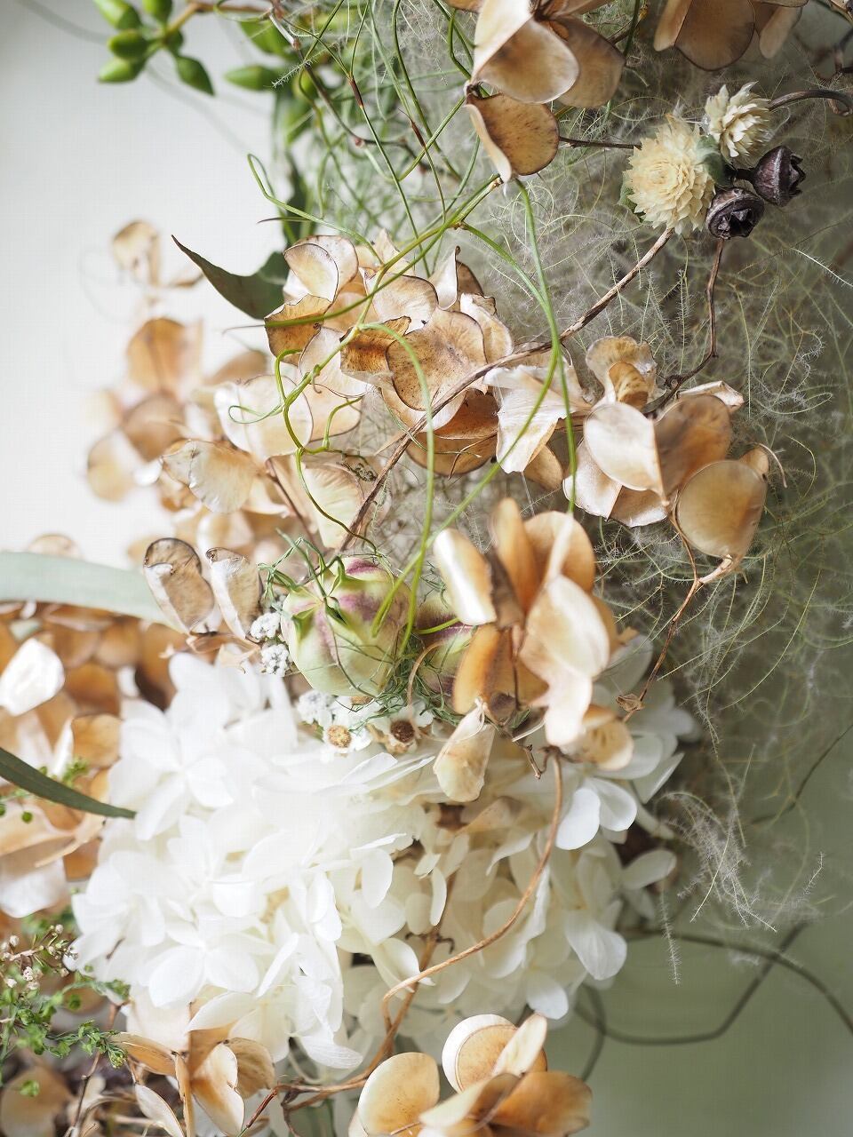 グリーンのスモークツリー・やまいものつる・白いあじさい・ユーカリの実などでふわふわっとつくりました。
