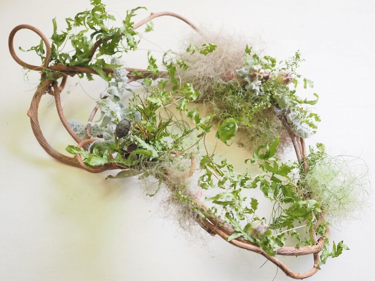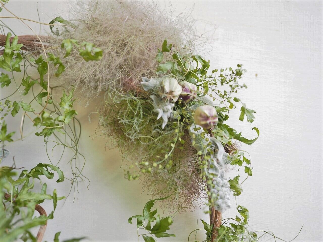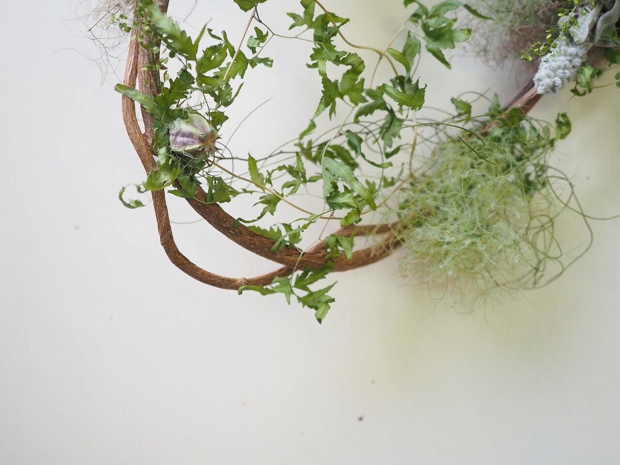 キウイのつるにグリーンのリーフやスモークツリー・ラムズイヤーなどからめてアレンジしました。