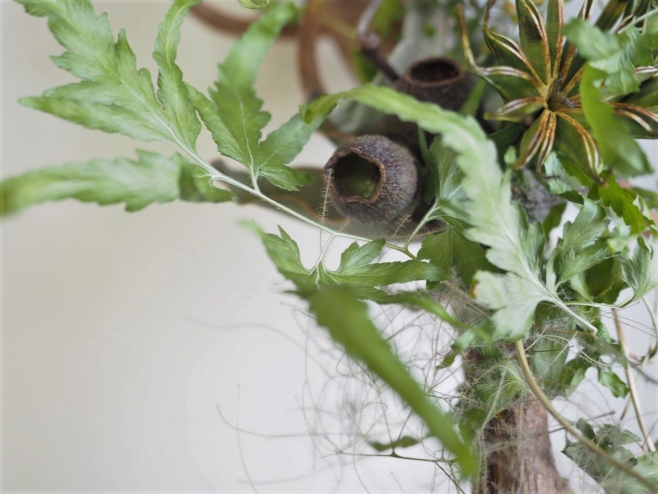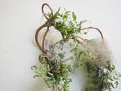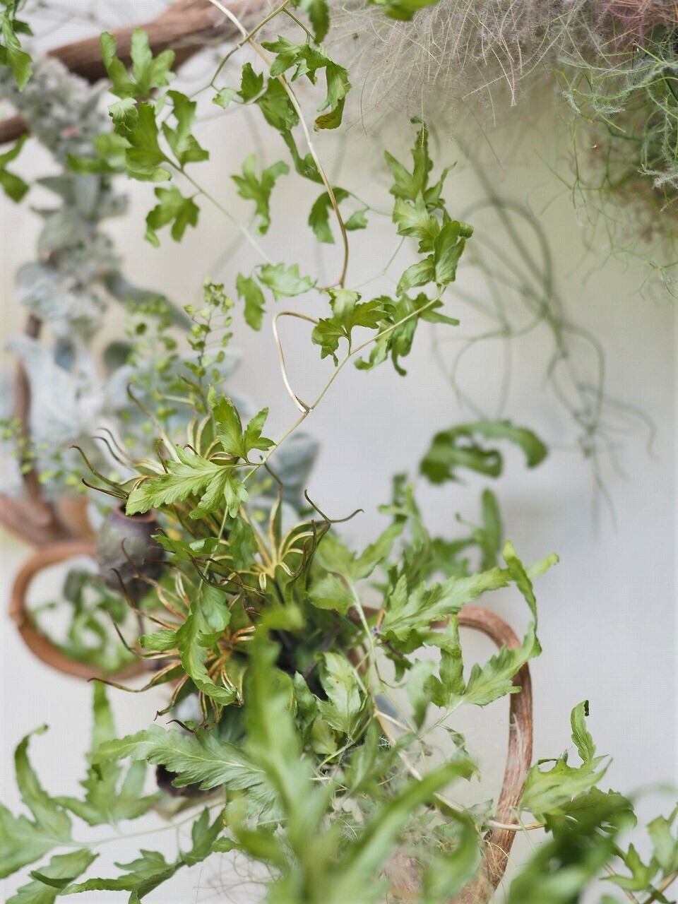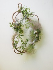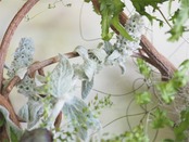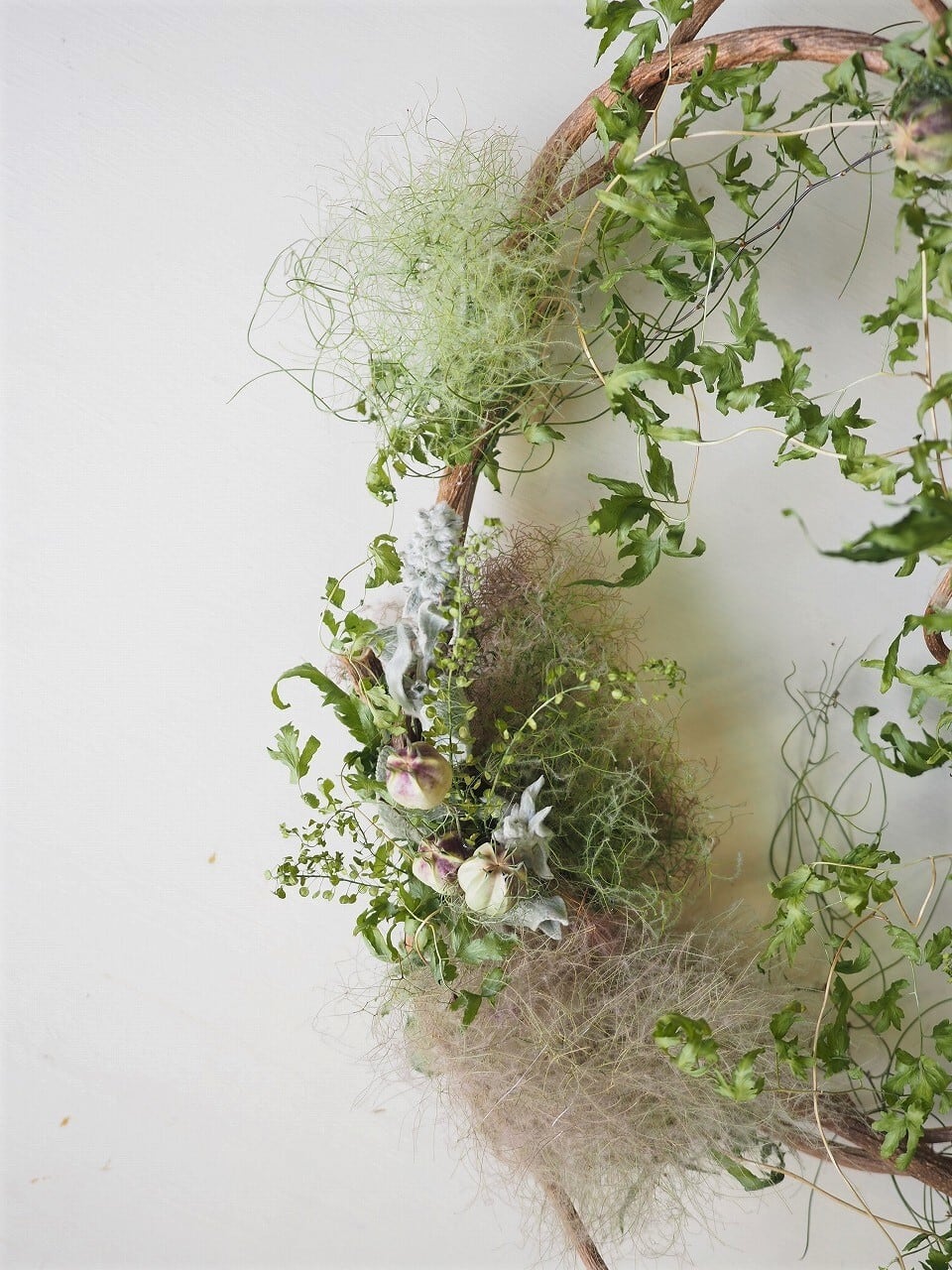 キウイのつるにグリーンのリーフやスモークツリー・ラムズイヤーなどからめてアレンジしました。