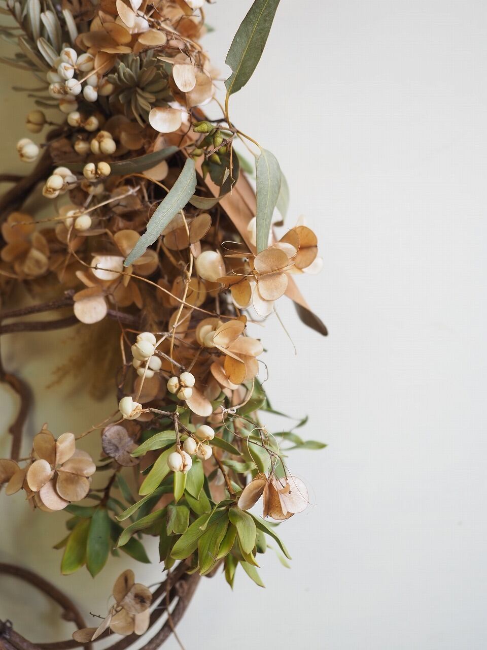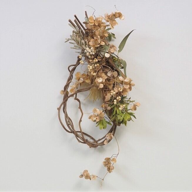 キウイのつるにやまいものつる・ナンキンハゼ・リューカデンドロなどでアレンジしています。少したれたやまいものつるがいい感じです。