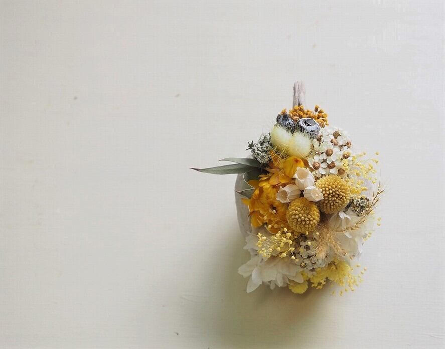 ブッダナッツという実の殻に黄色や白い実や小花をたくさん詰め込みました。