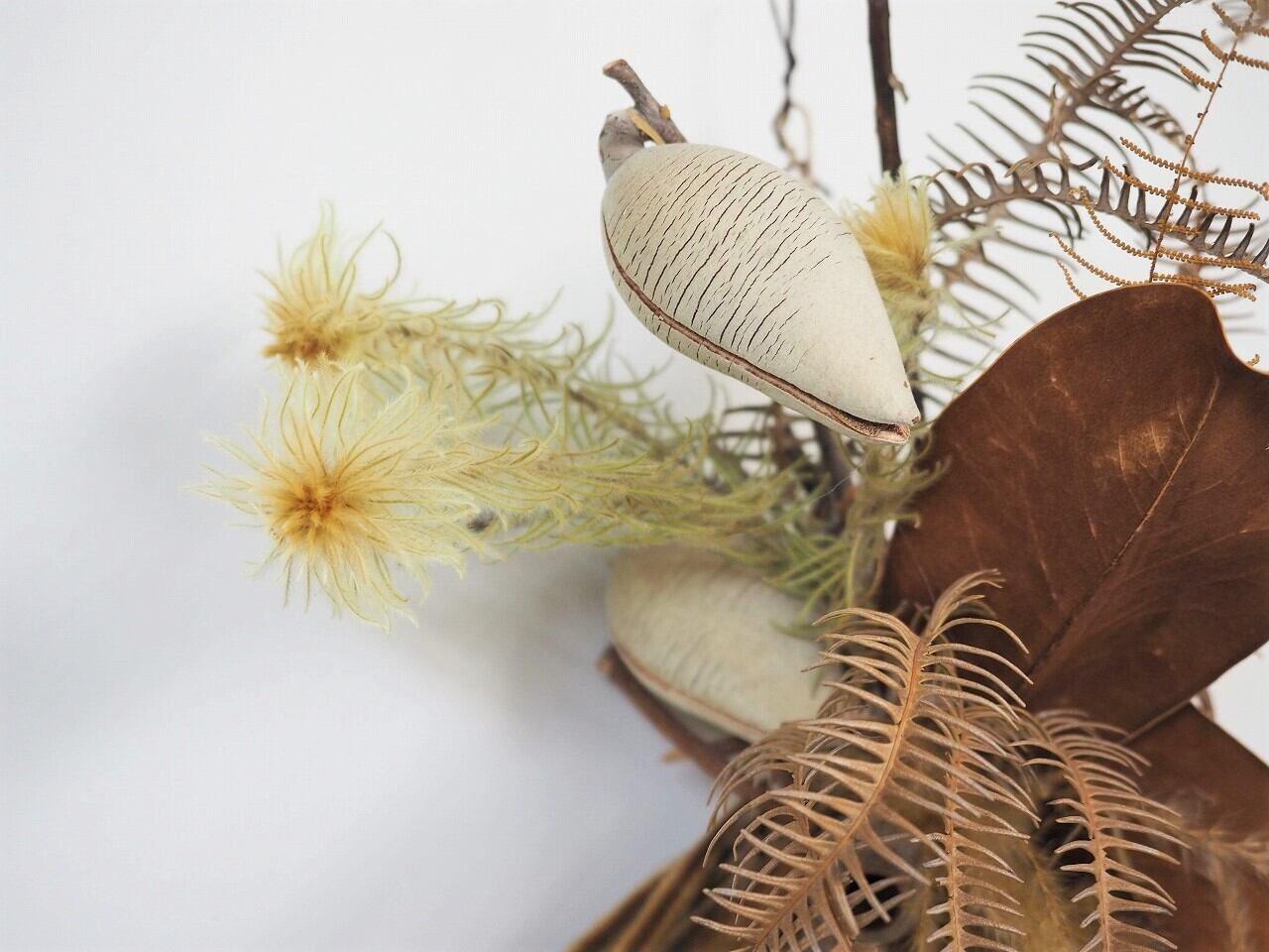 ベルベットビーンズ・ウッディペア・フィリカ・プロテアなどでアレンジしたスワッグです。