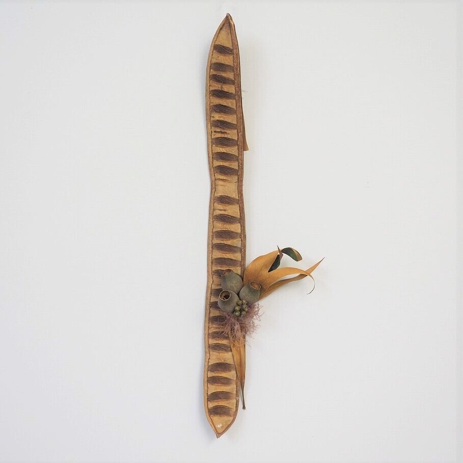 ステップフルーツという実の殻にユーカリトランペット・セルリア・グレビリアゴールドなどをすこし足してアレンジしてみました。