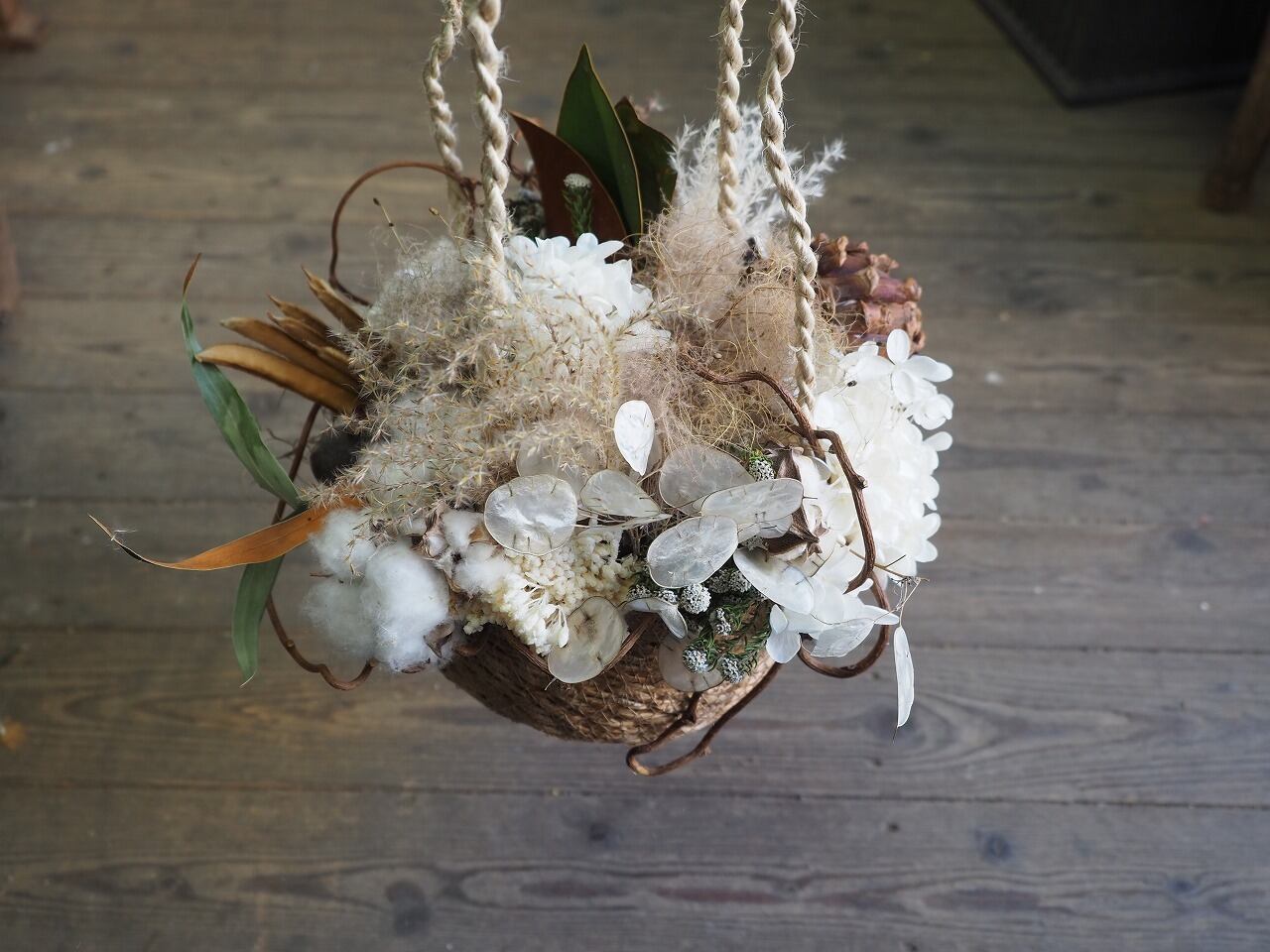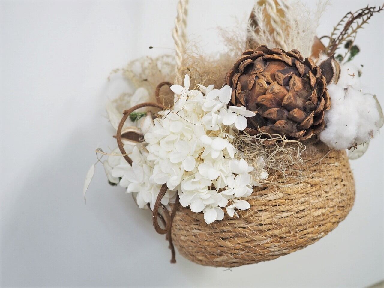 バスケットにドライフラワー詰め込んだアレンジです。