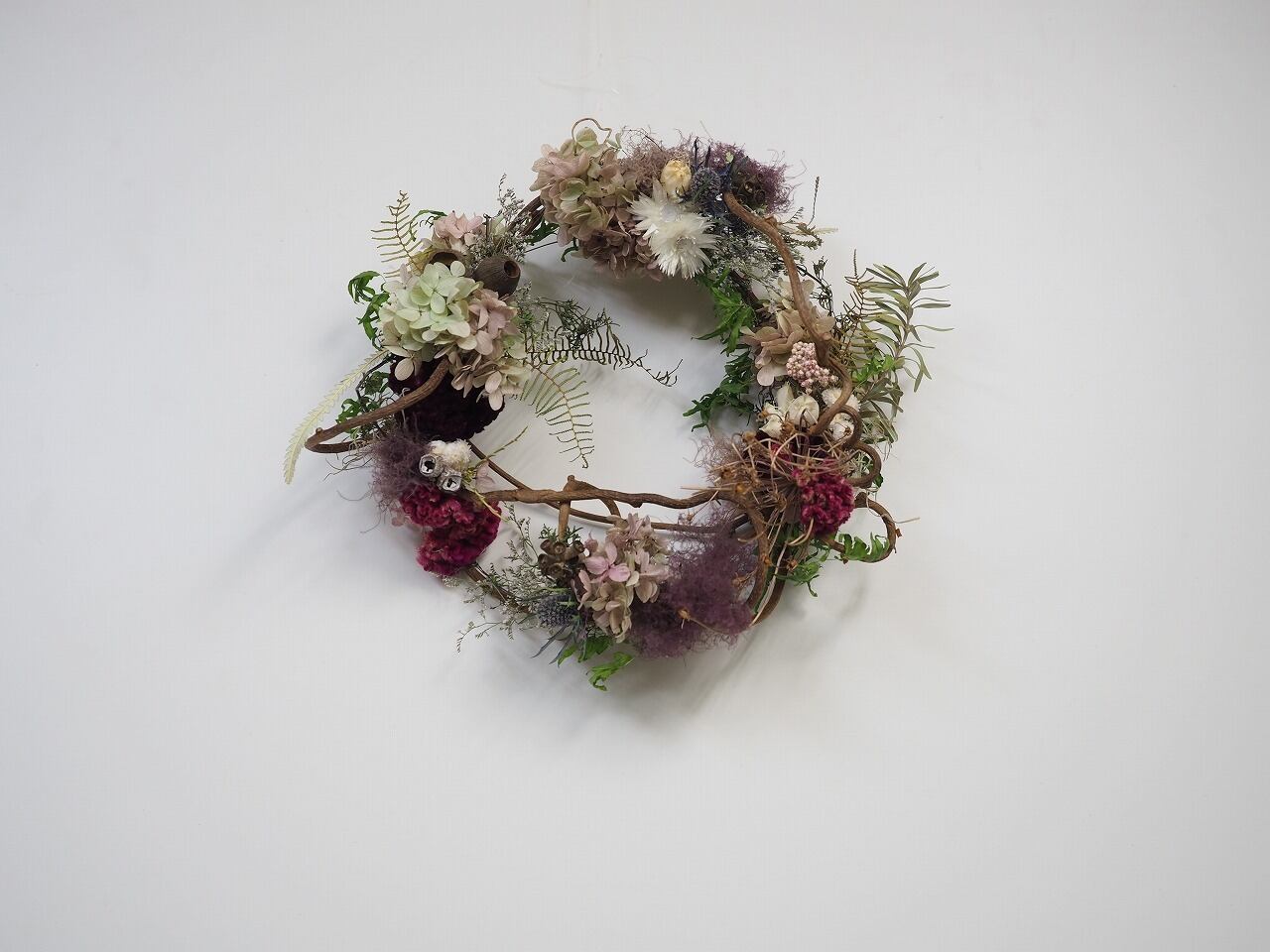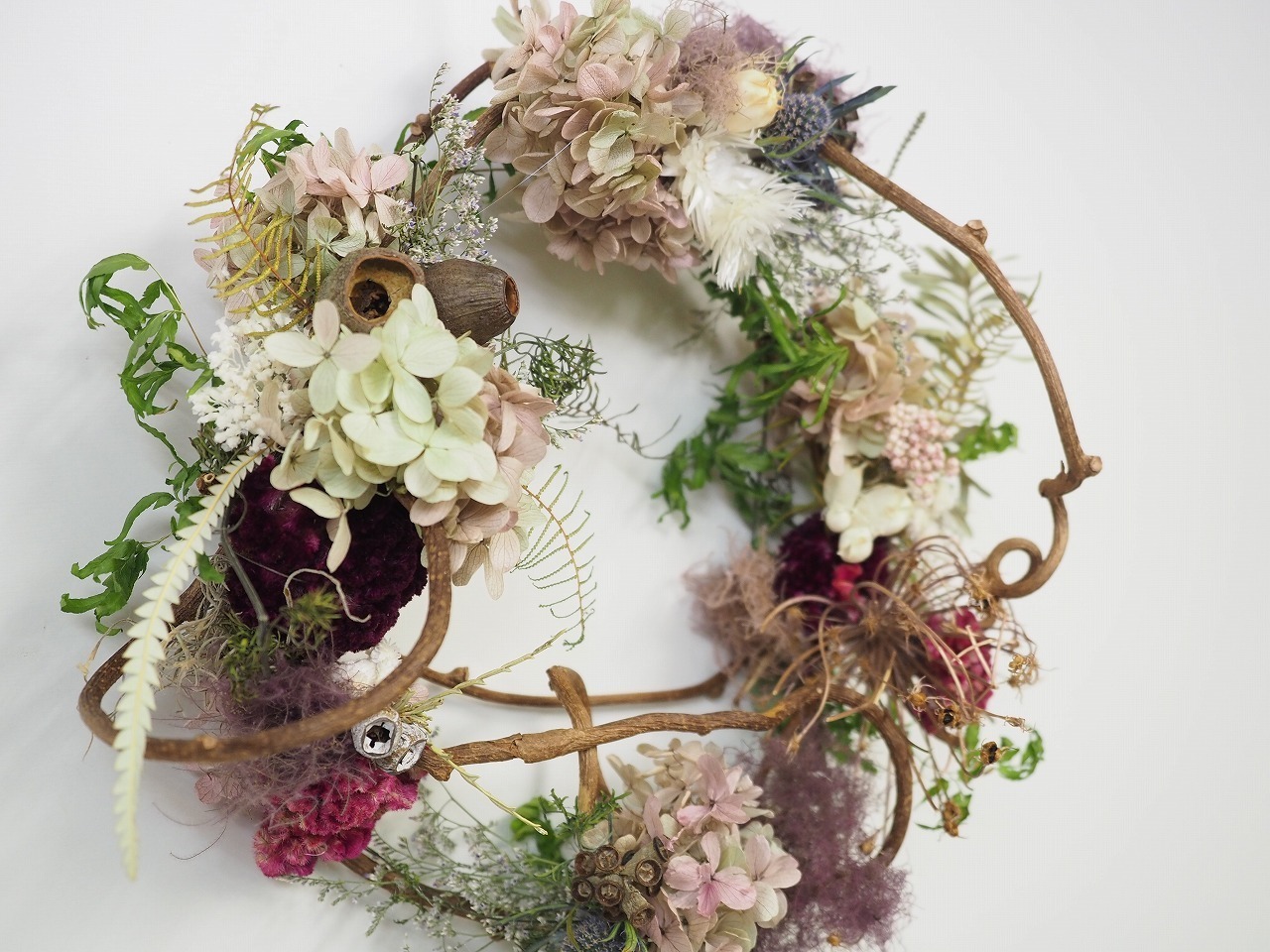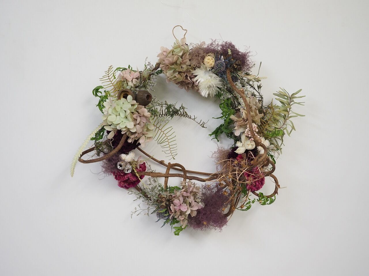 からませたツルにくすみピンクのあじさい・スモークツリー・実もの・グリーンのリーフなどで作りました。大人かわいい感じのリースで、プレゼントにもいいですね。