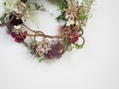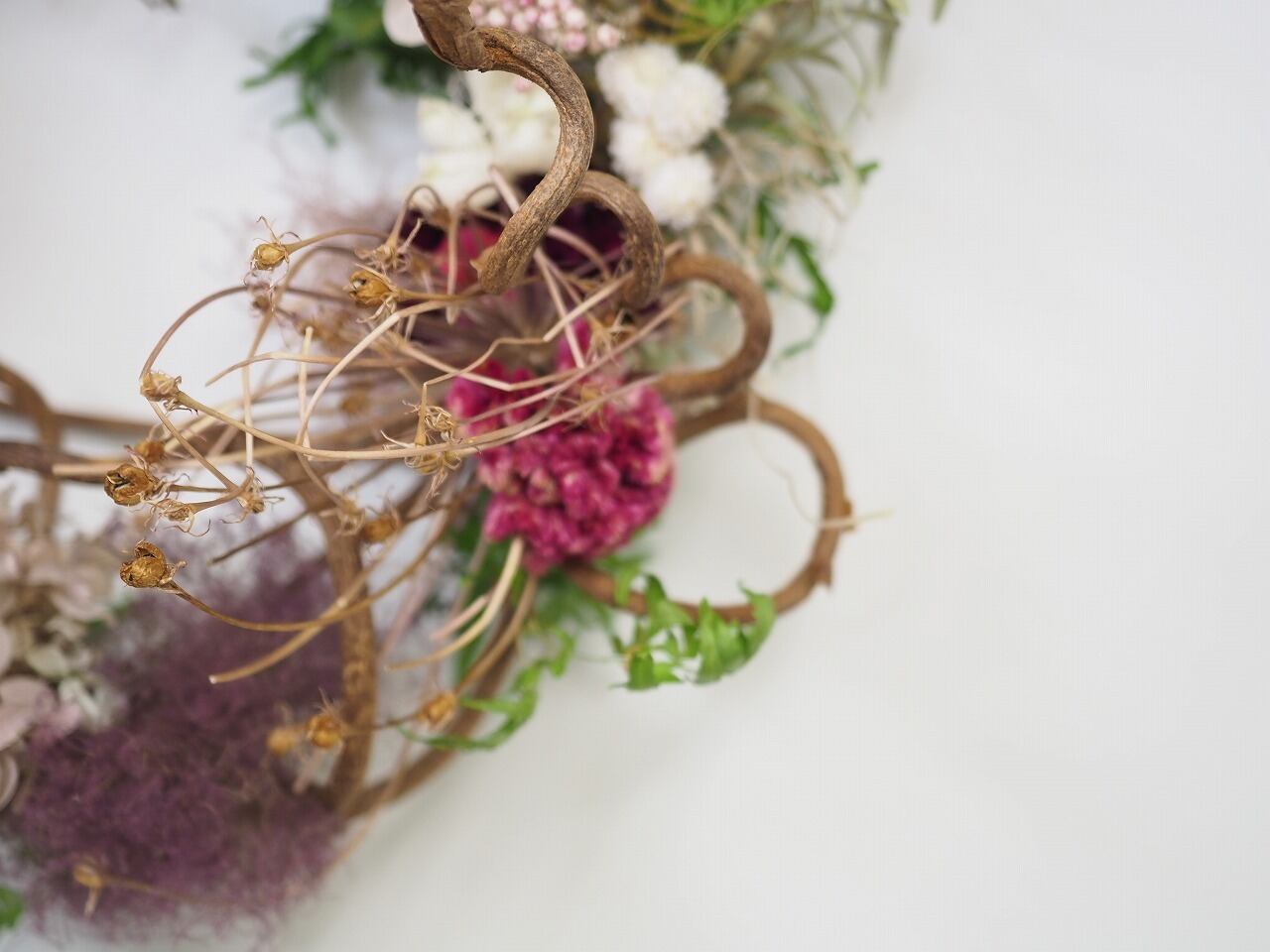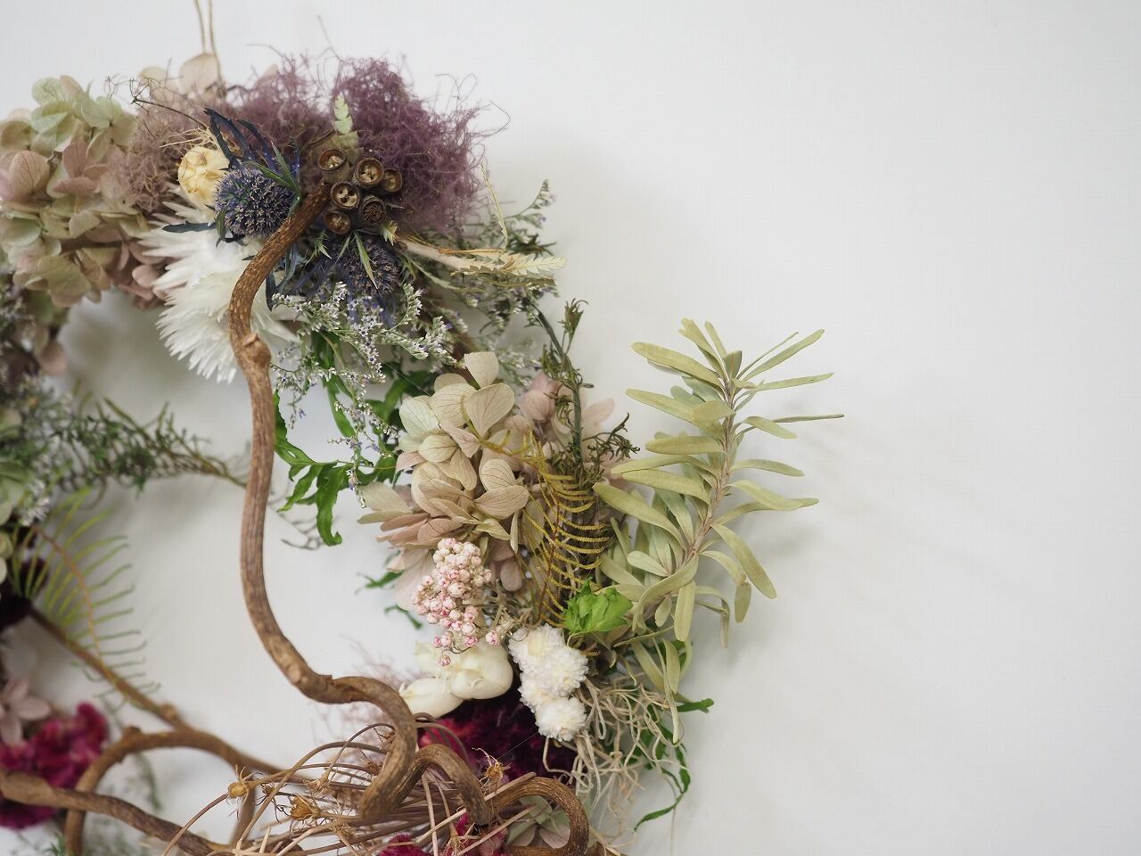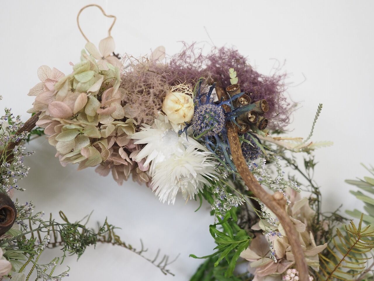 からませたツルにくすみピンクのあじさい・スモークツリー・実もの・グリーンのリーフなどで作りました。大人かわいい感じのリースで、プレゼントにもいいですね。