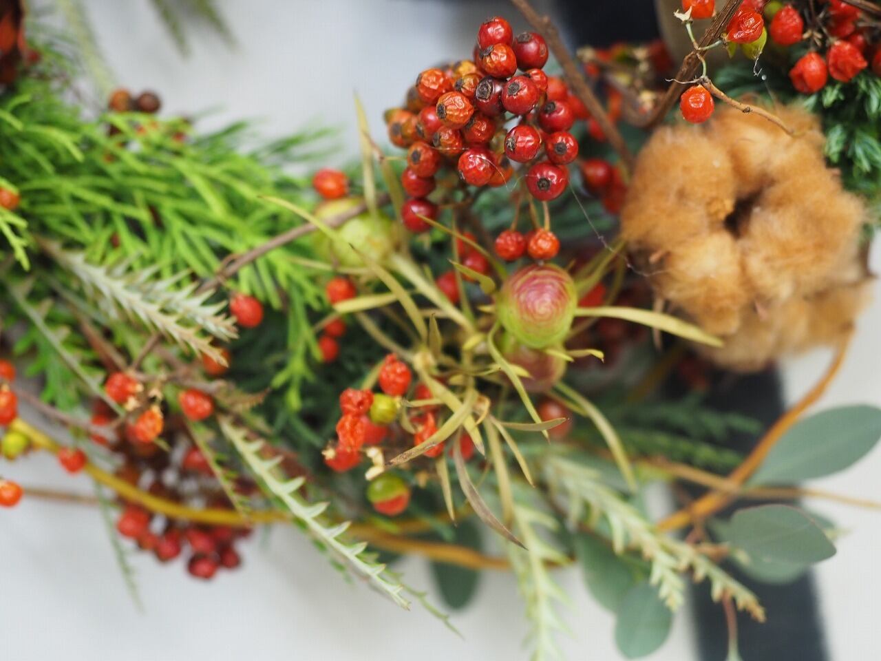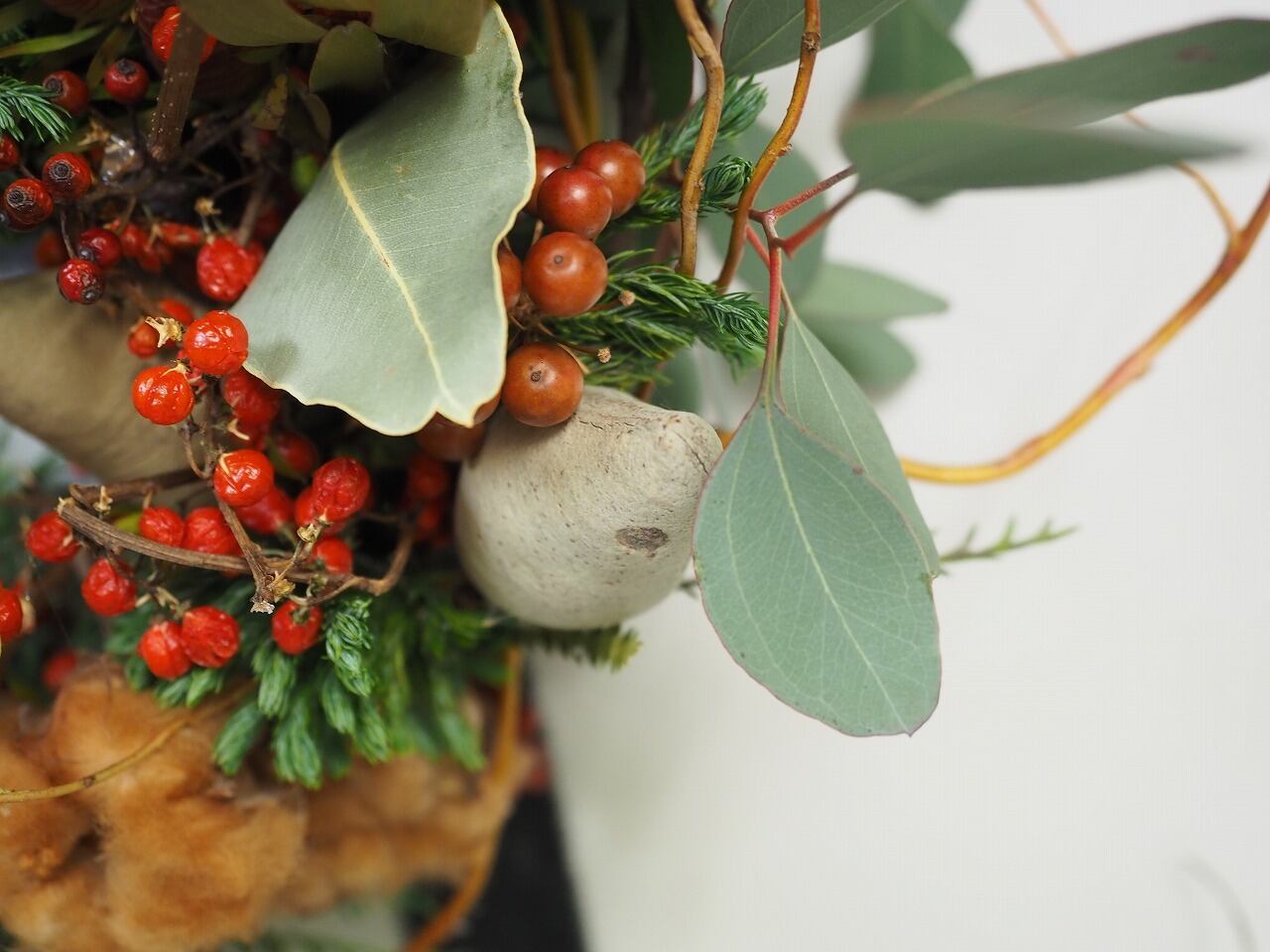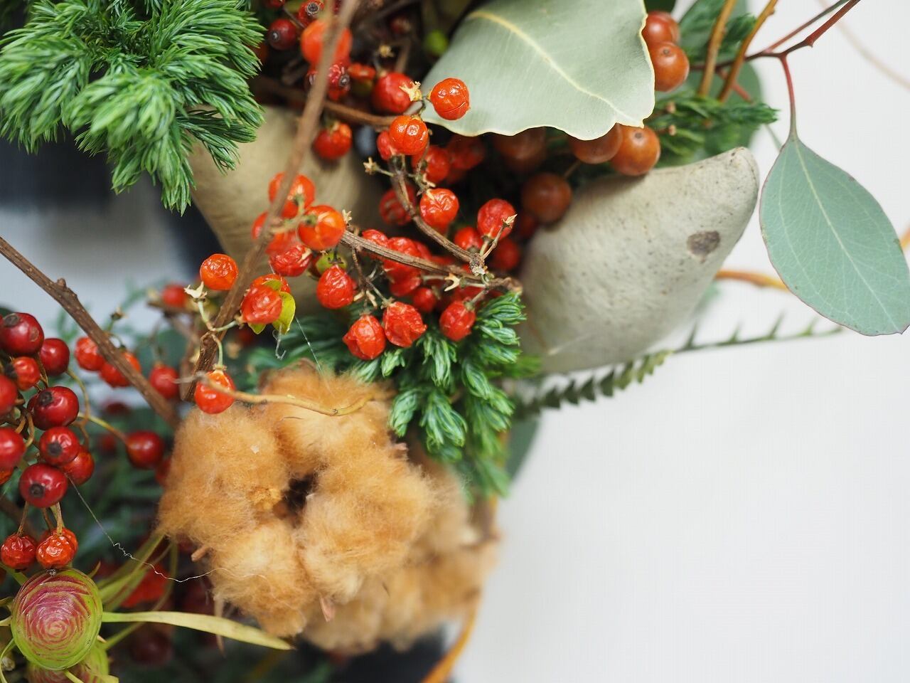 クリスマスっぽいリーフやユーカリにのいばらの実や茶色いコットンをいれて