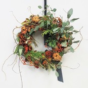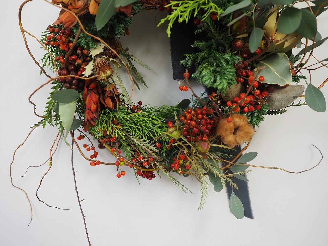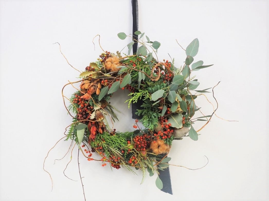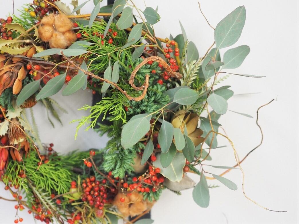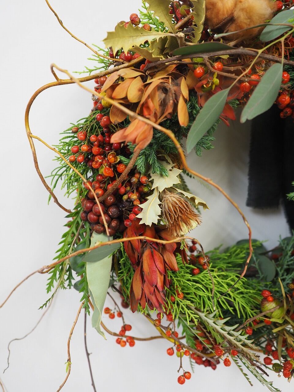 クリスマスっぽいリーフやユーカリにのいばらの実や茶色いコットンをいれて