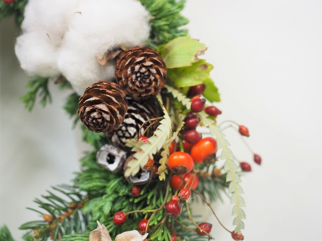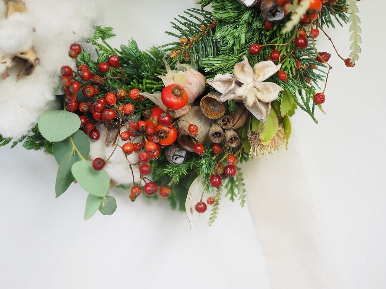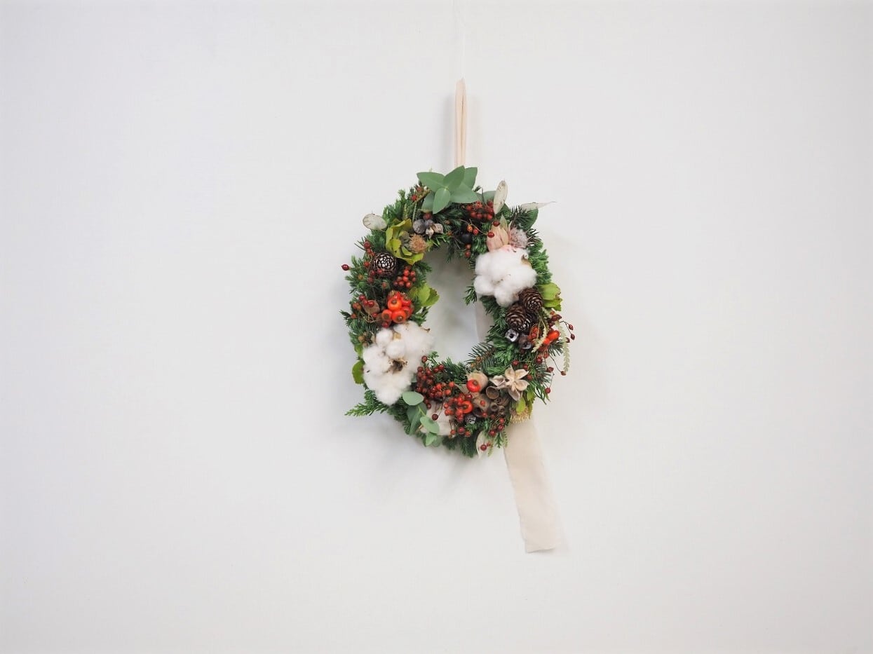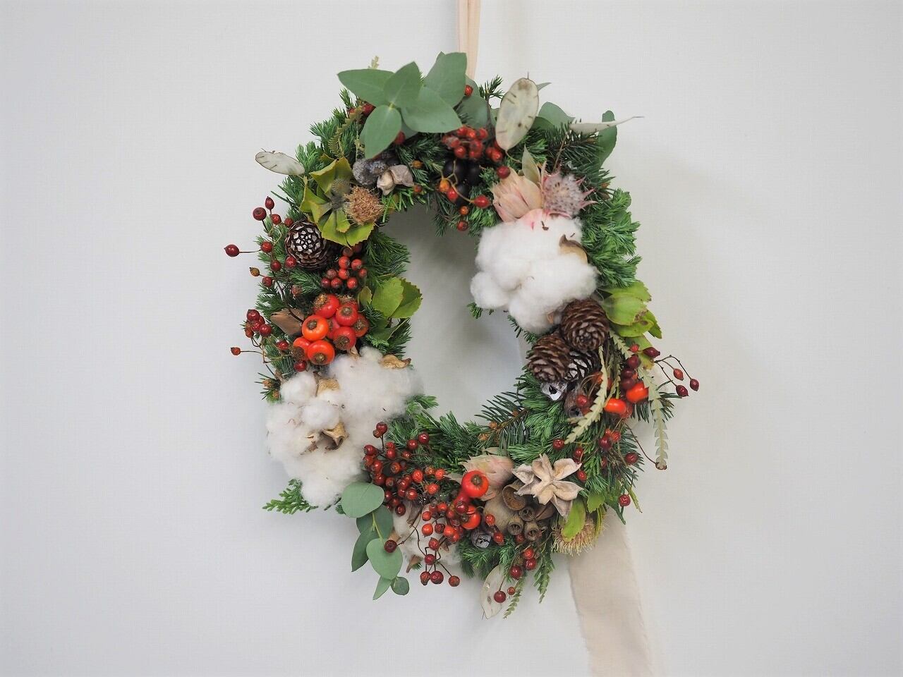 スギなどクリスマスっぽいリーフを使い、オーバルの形に作っています。