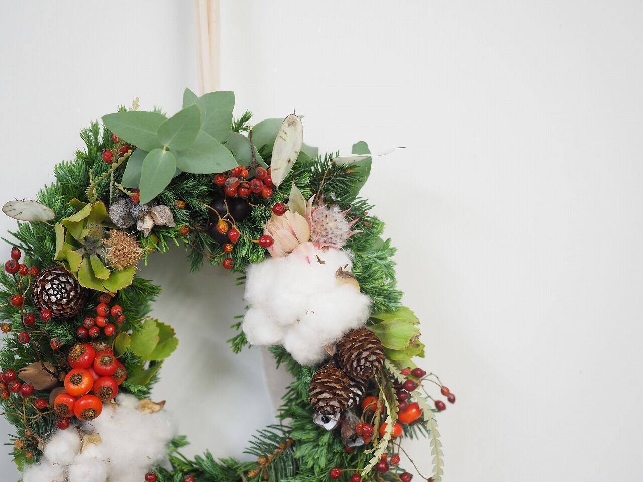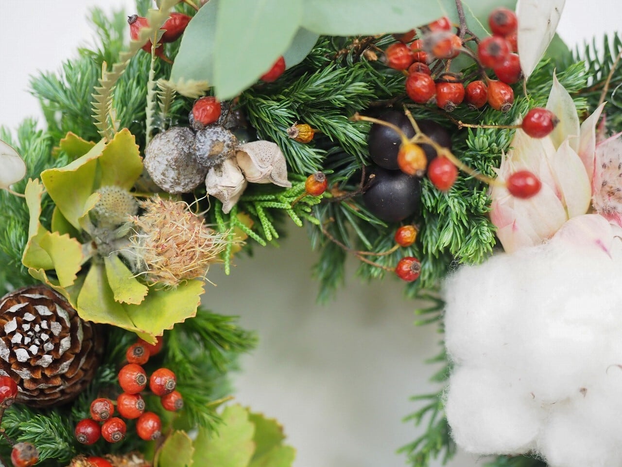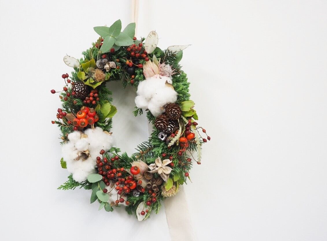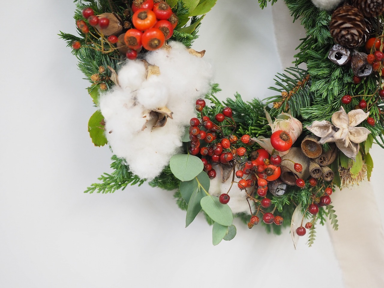 スギなどクリスマスっぽいリーフを使い、オーバルの形に作っています。