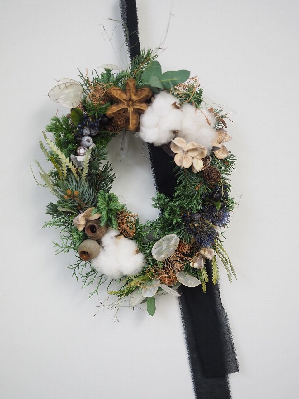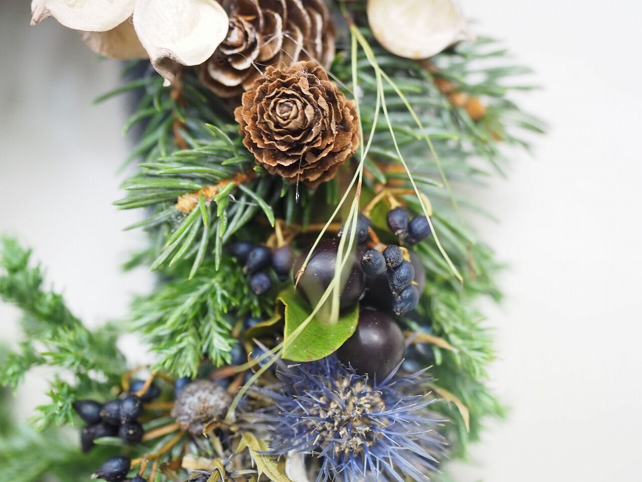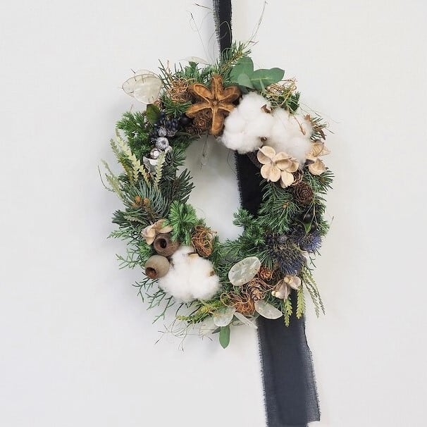 スギなどクリスマスっぽいリーフを使い、オーバルの形に作っています。
