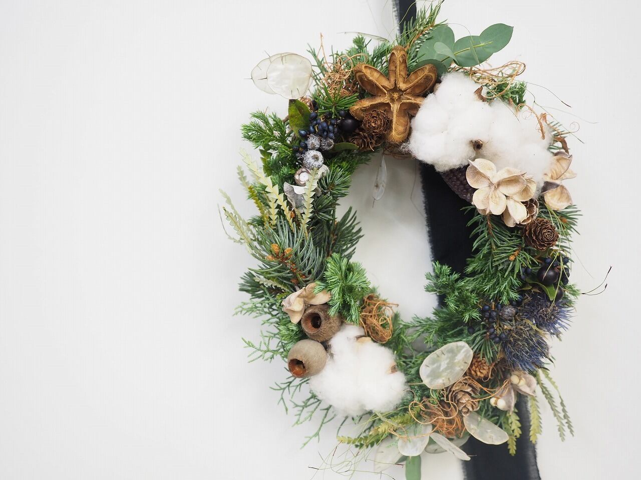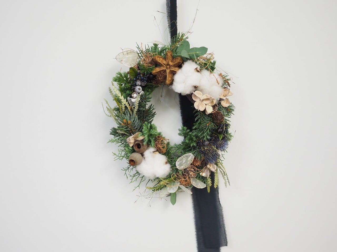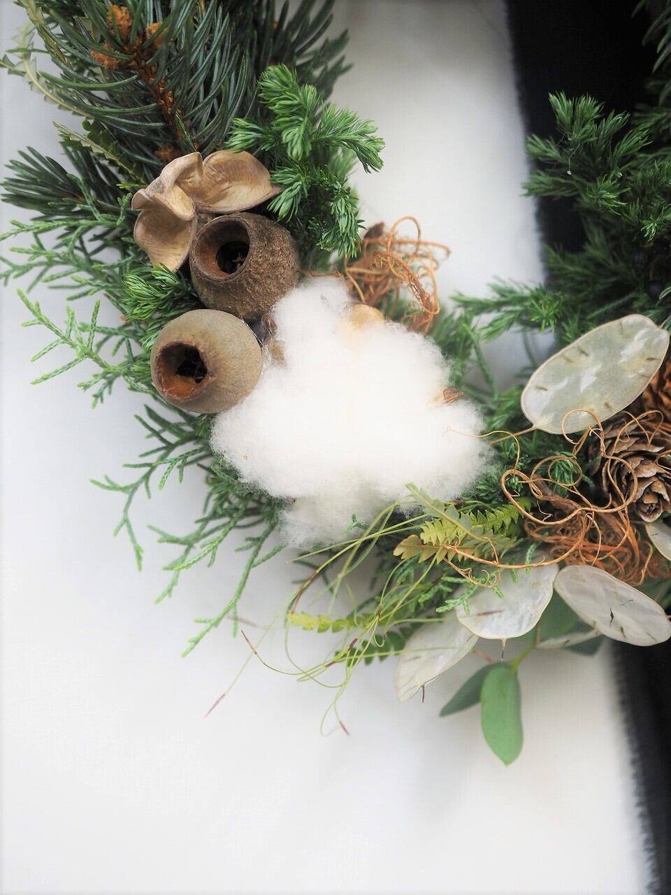スギなどクリスマスっぽいリーフを使い、オーバルの形に作っています。