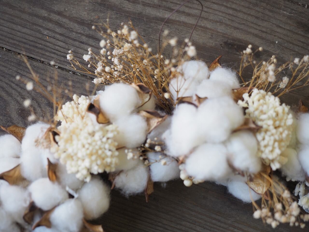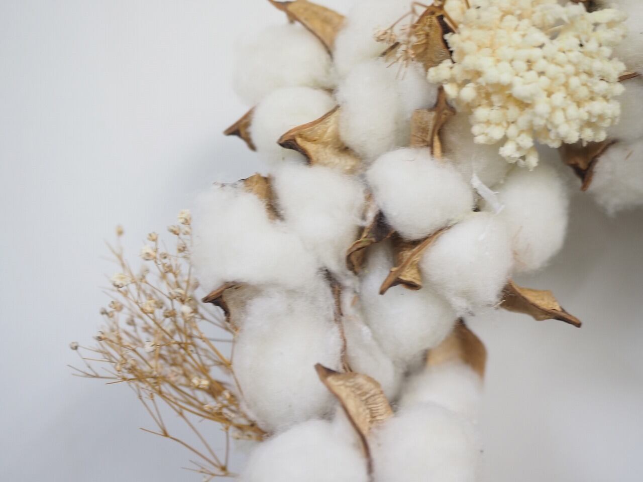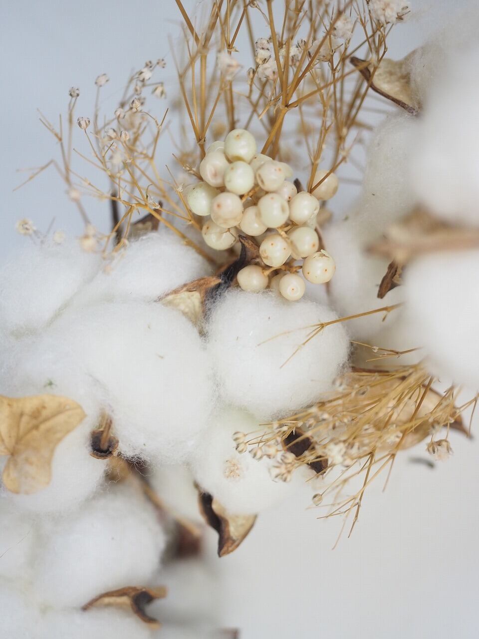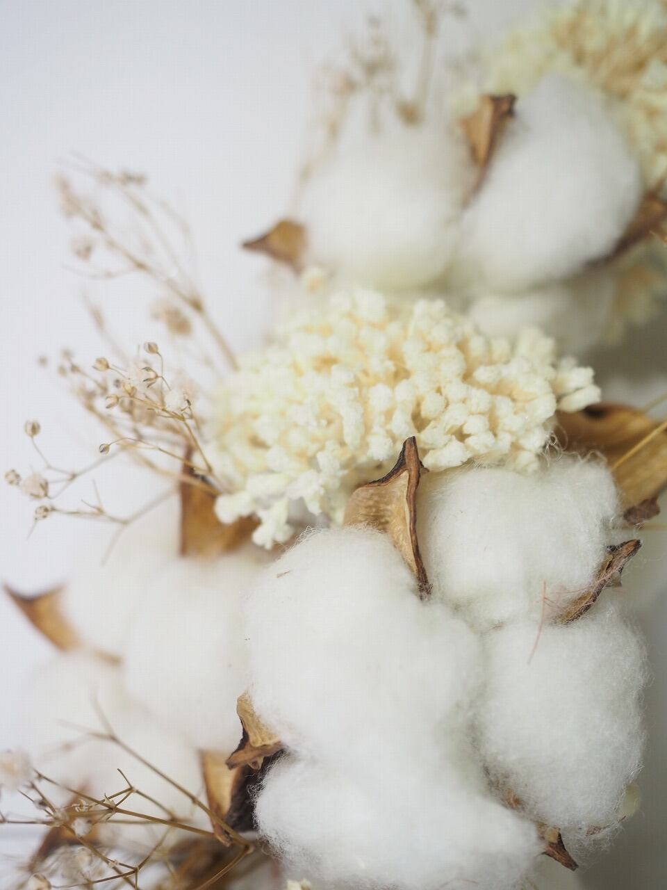コットンをメインにかすみ草や白い小花を入れてつくりました。