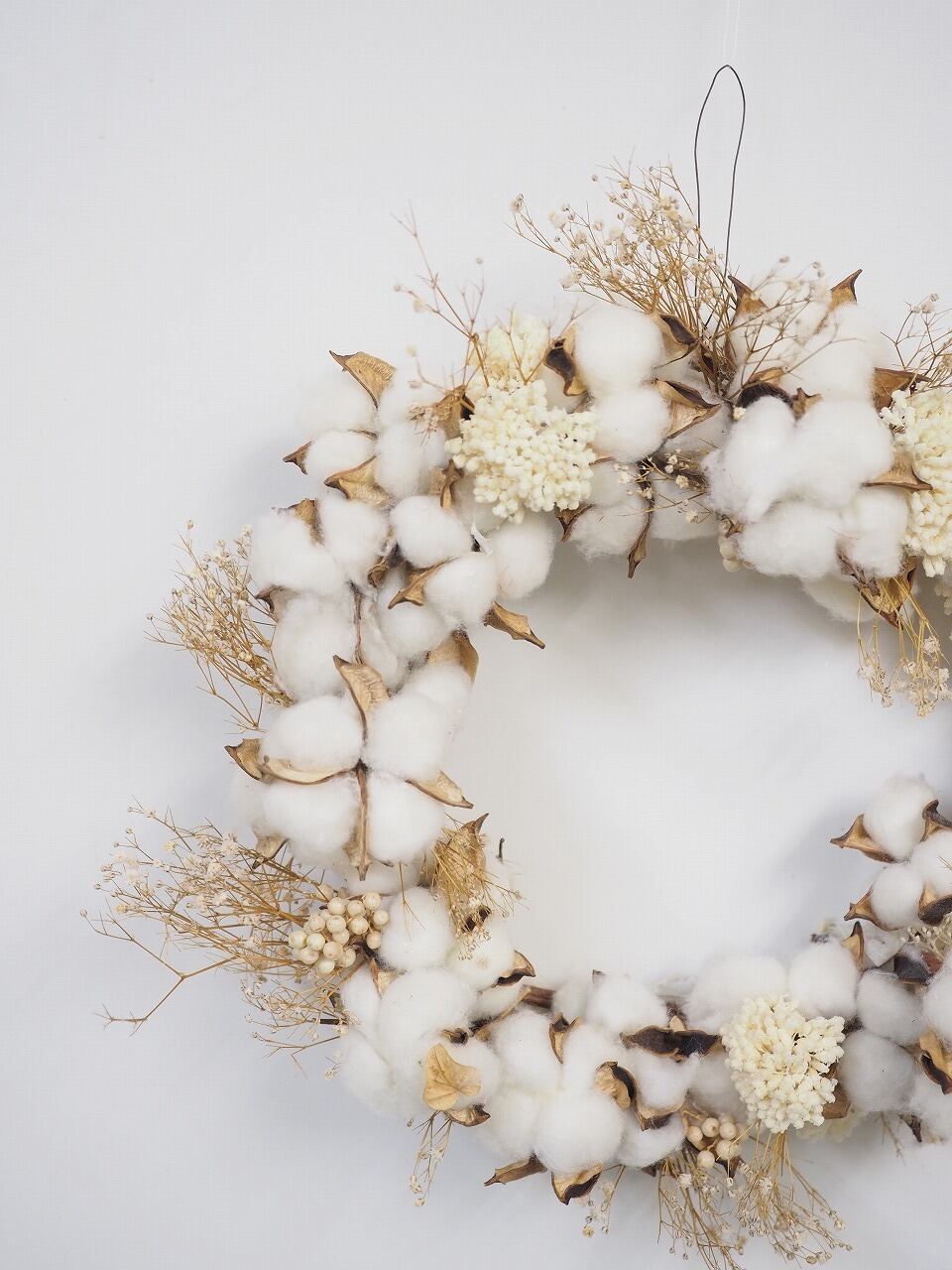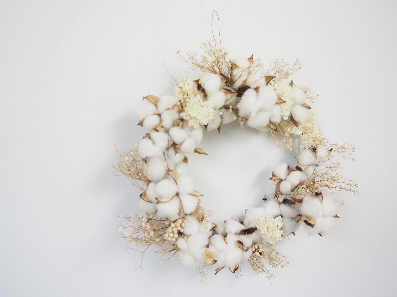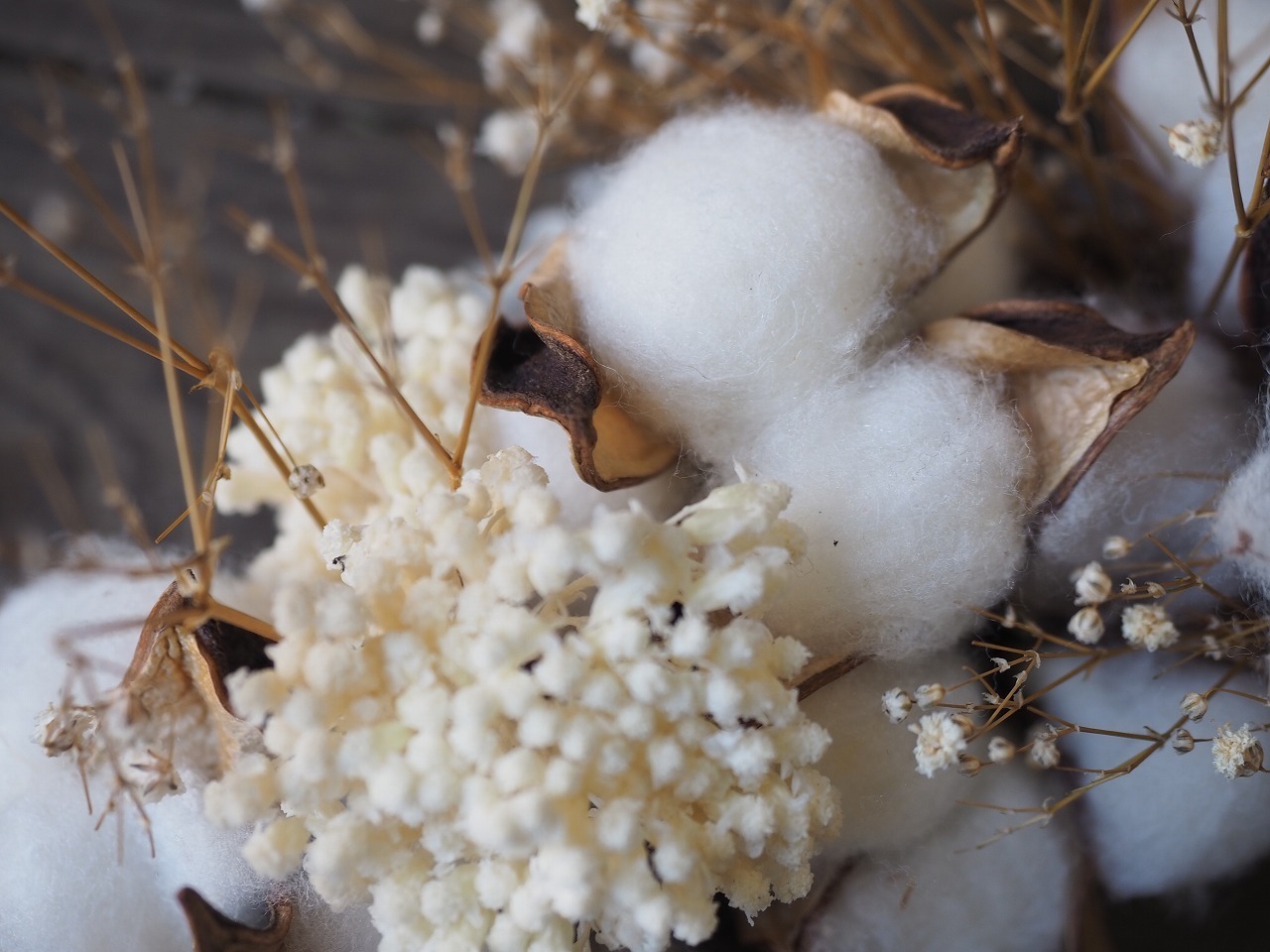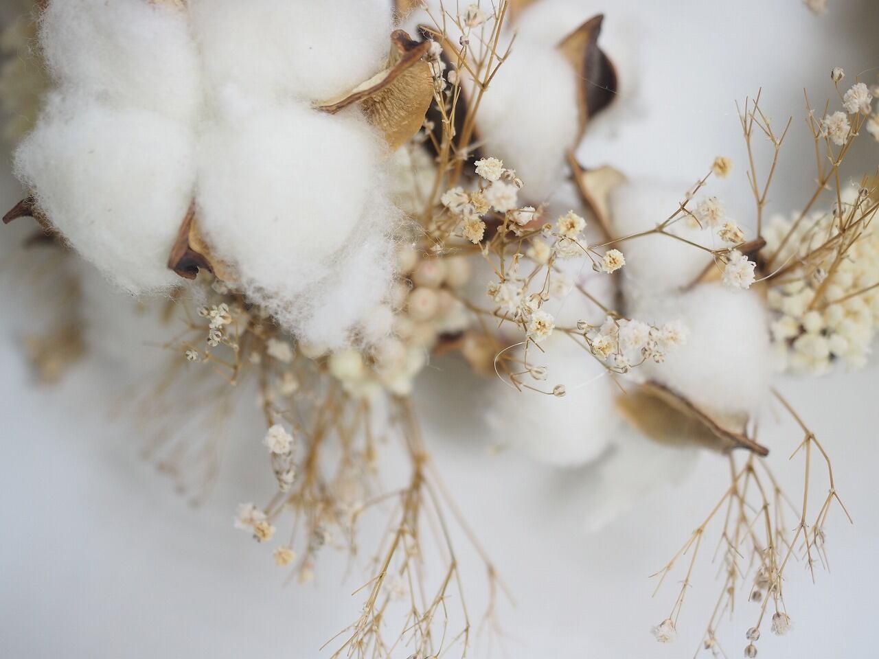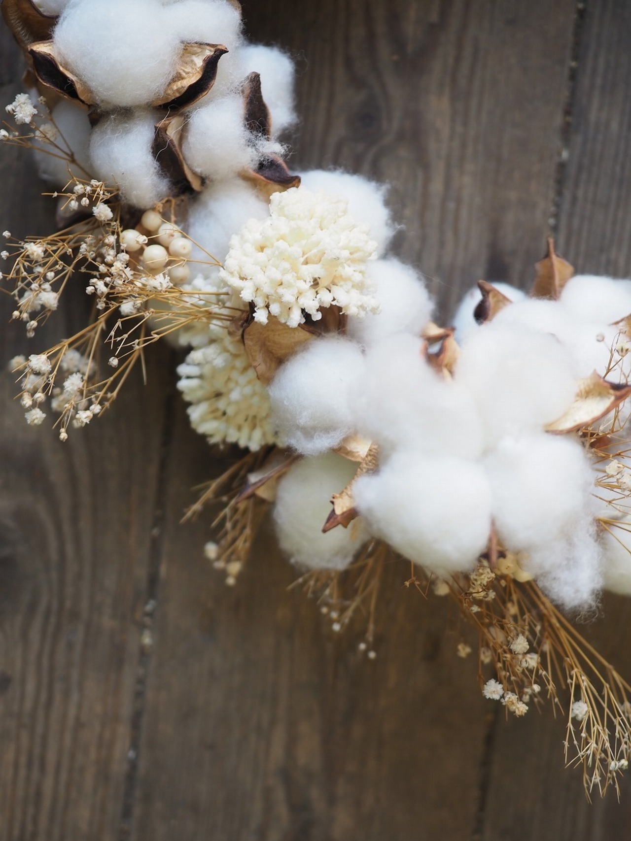 コットンをメインにかすみ草や白い小花を入れてつくりました。