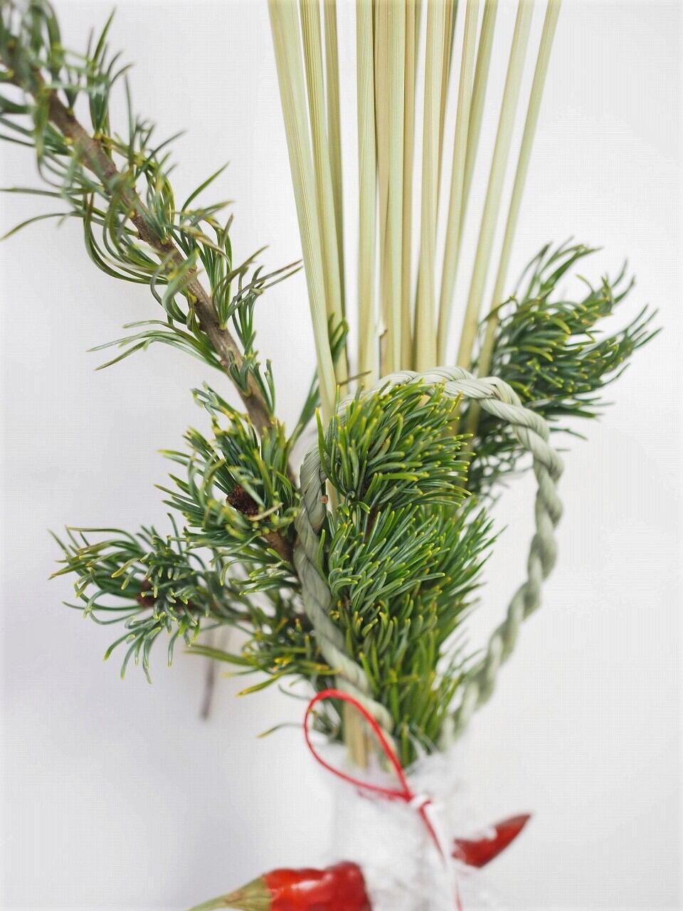 五葉松・お米・唐辛子の飾りなどで作りました。