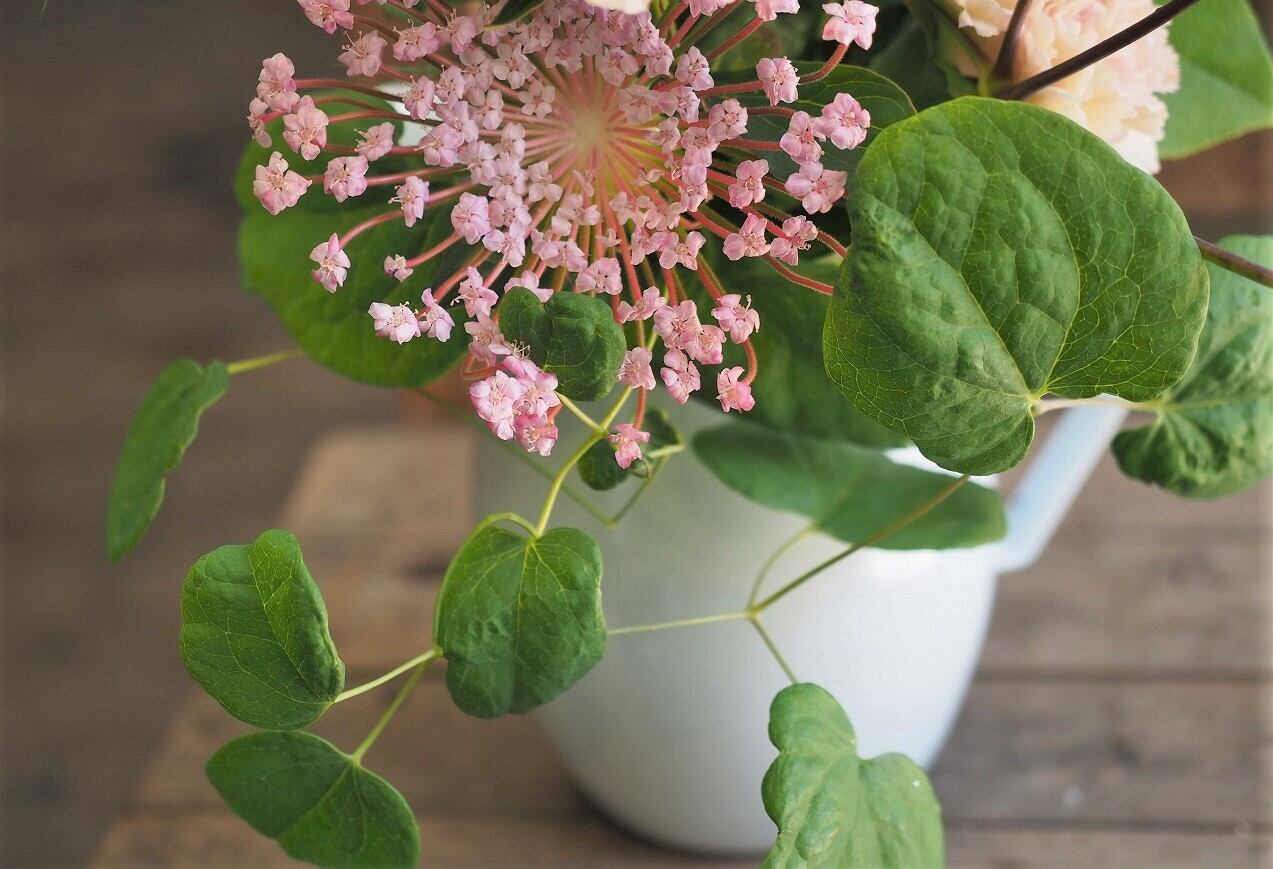 母の日用の生花の花束です。白色のピッチャー付きです。