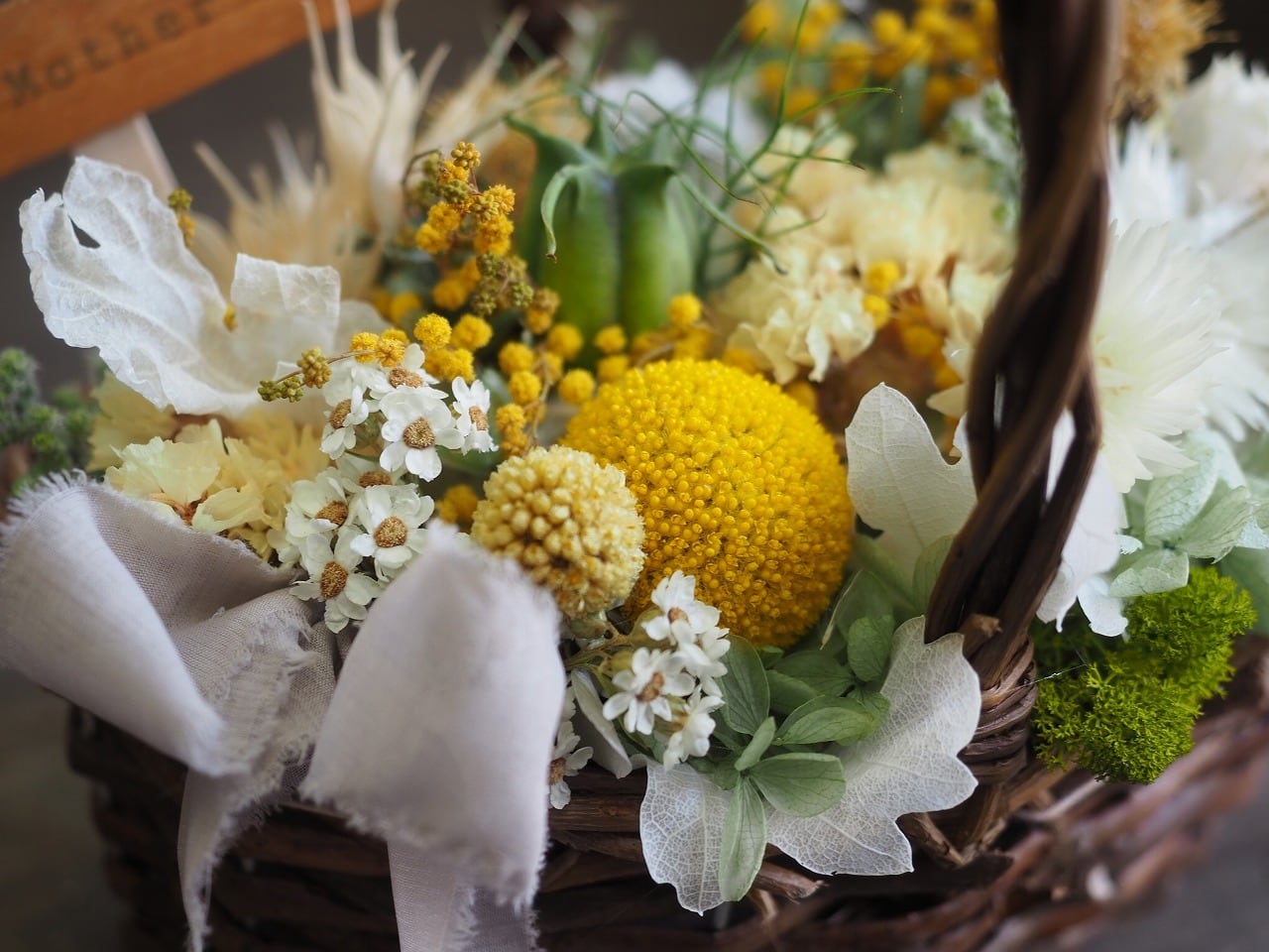 プリザーブドフラワーやドライフラワーのイエロー系のお花を使ってお作りしています。