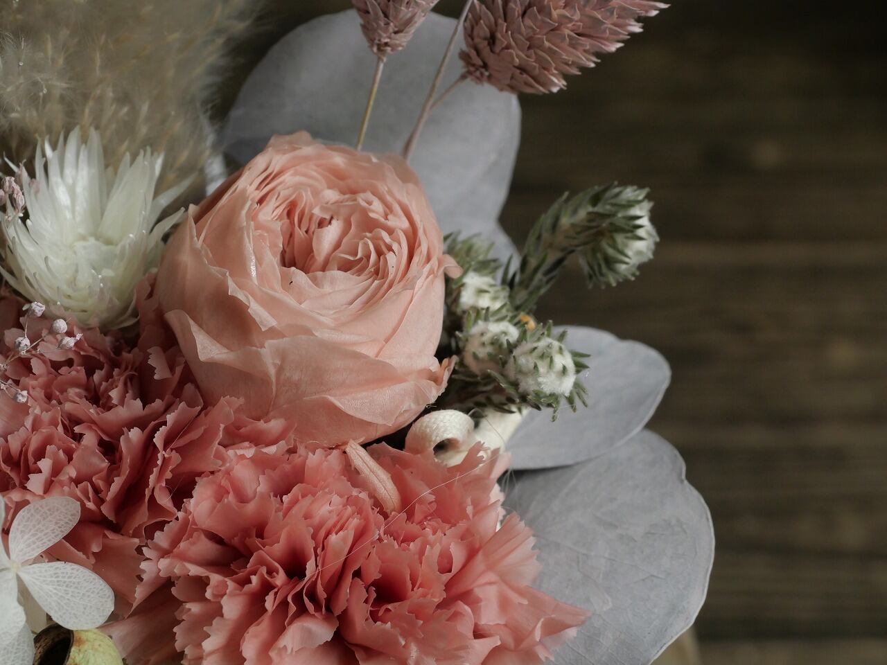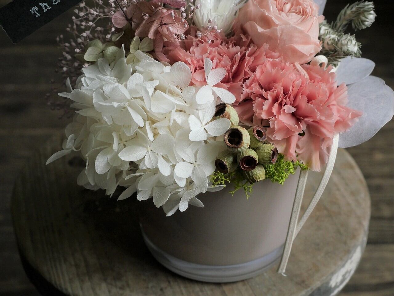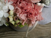 プリザーブドフラワーのカーネーションやバラ、アジサイなどのお花を使ってお作りしています。