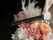 プリザーブドフラワーのカーネーションやバラ、アジサイなどのお花を使ってお作りしています。