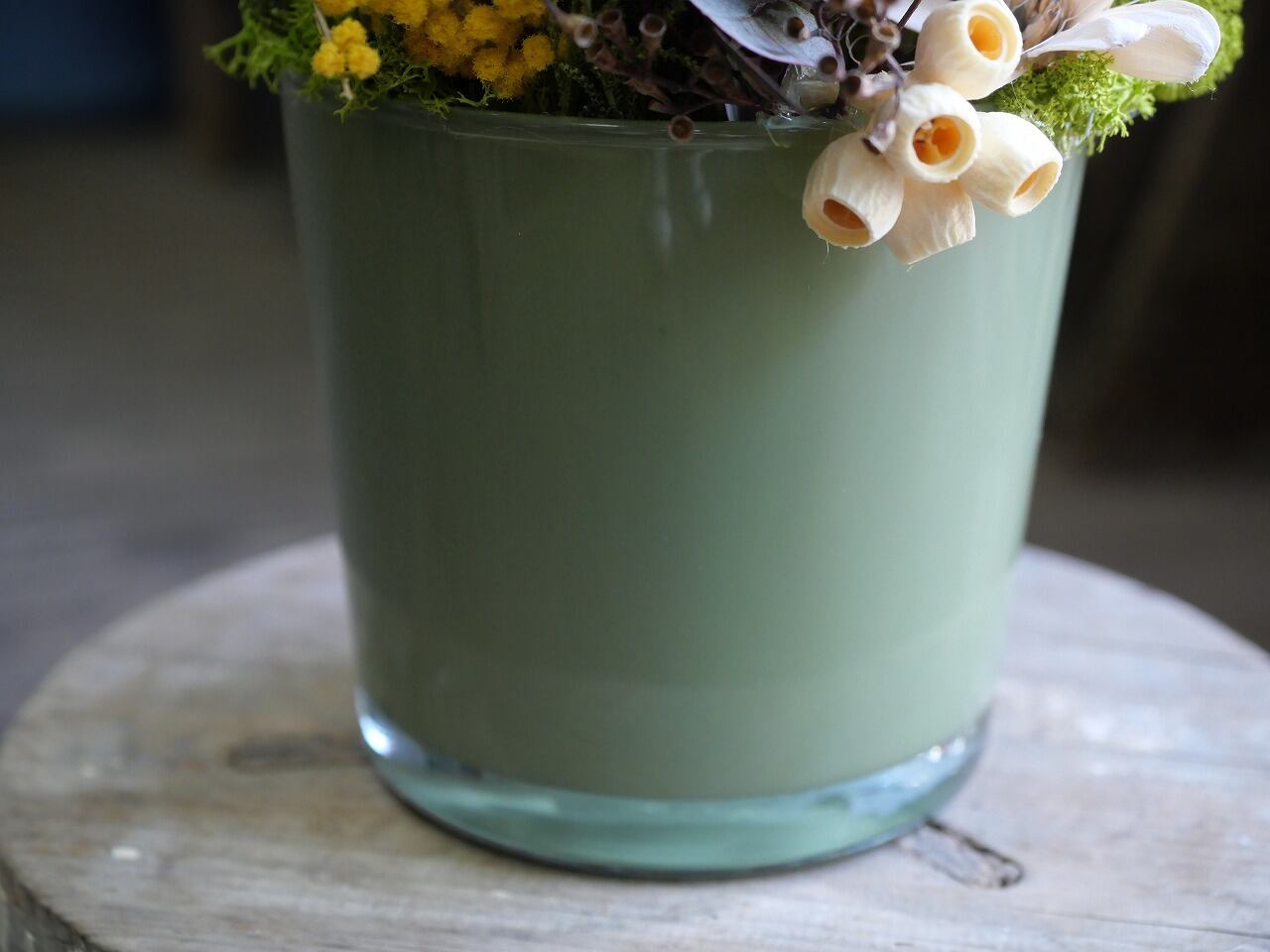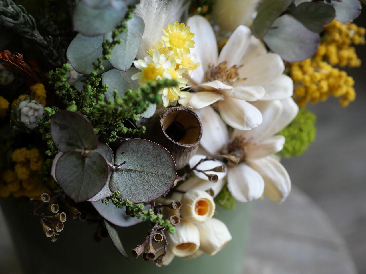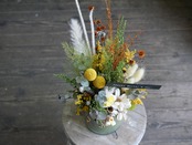 ドライフラワーやプリザーブドフラワーのイエロー系や白グリーンなどの色味のお花を使ってお作りしています。