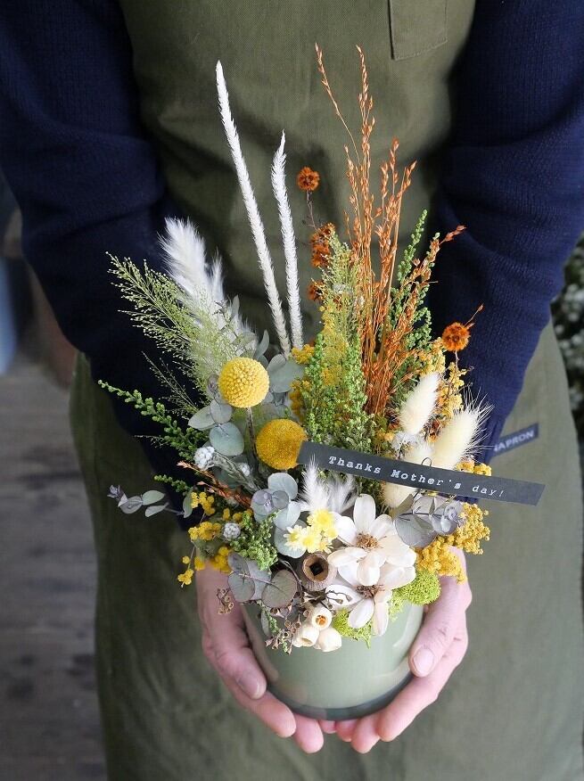 母の日用のプリザーブドフラワーとドライフラワーのアレンジメントです。