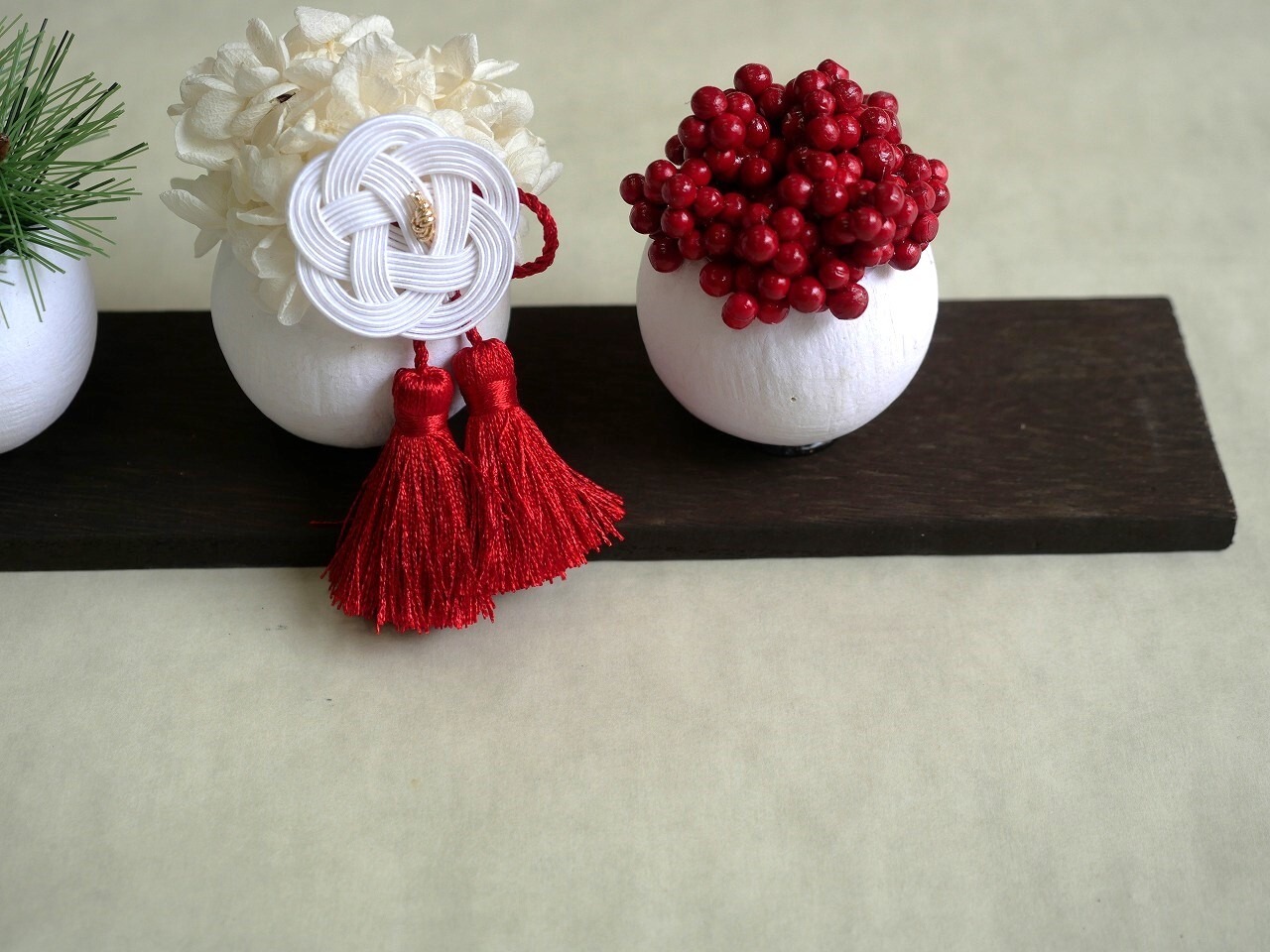 ベルカップという器に赤い実・アジサイ・松をアレンジしています。