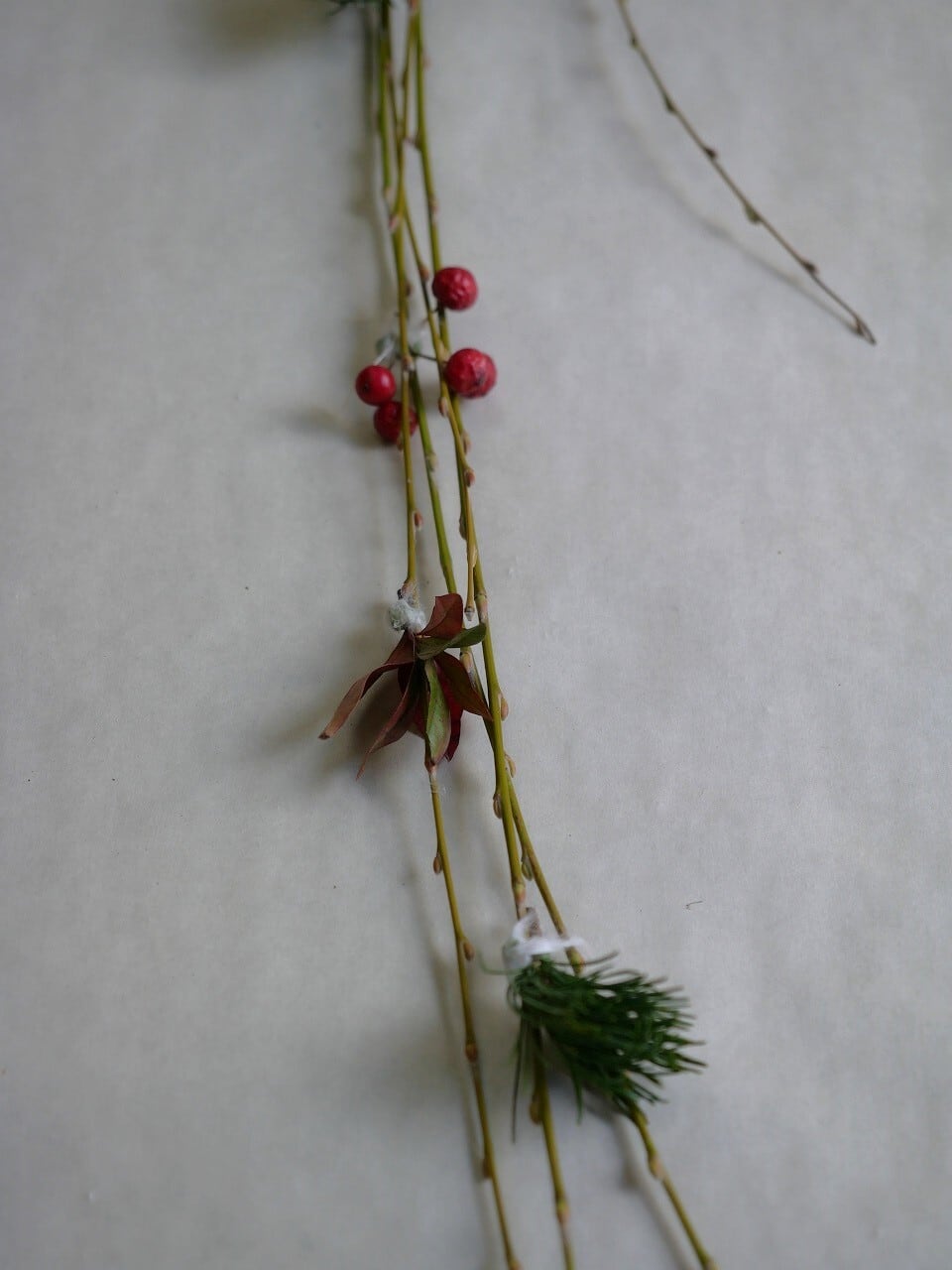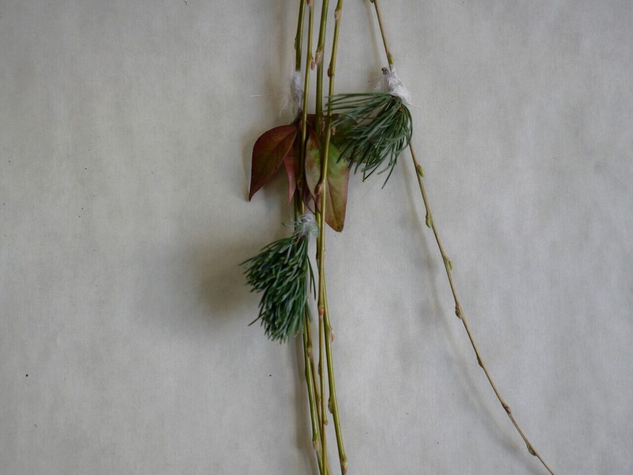 柳には松や南天の葉、赤い実をつけています。