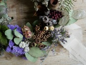 ユーカリをベースにドライフラワーやプリザーブドフラワーのお花などで落ち着いた雰囲気でお作りしています。