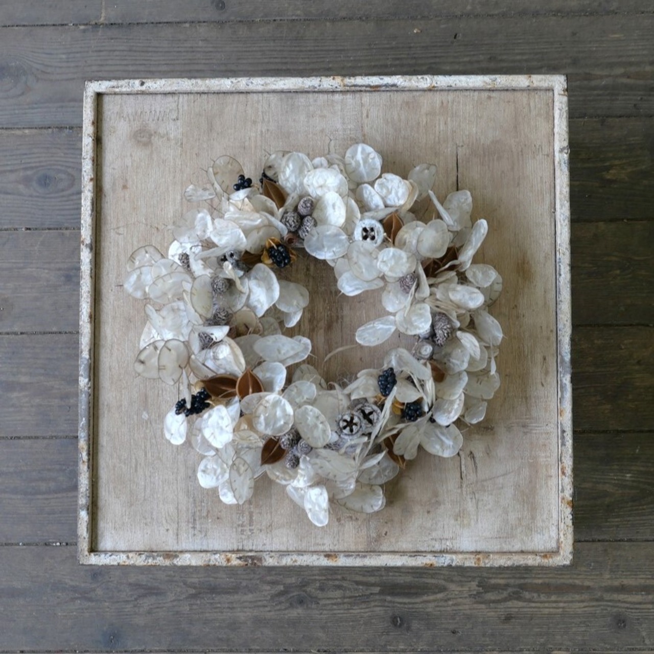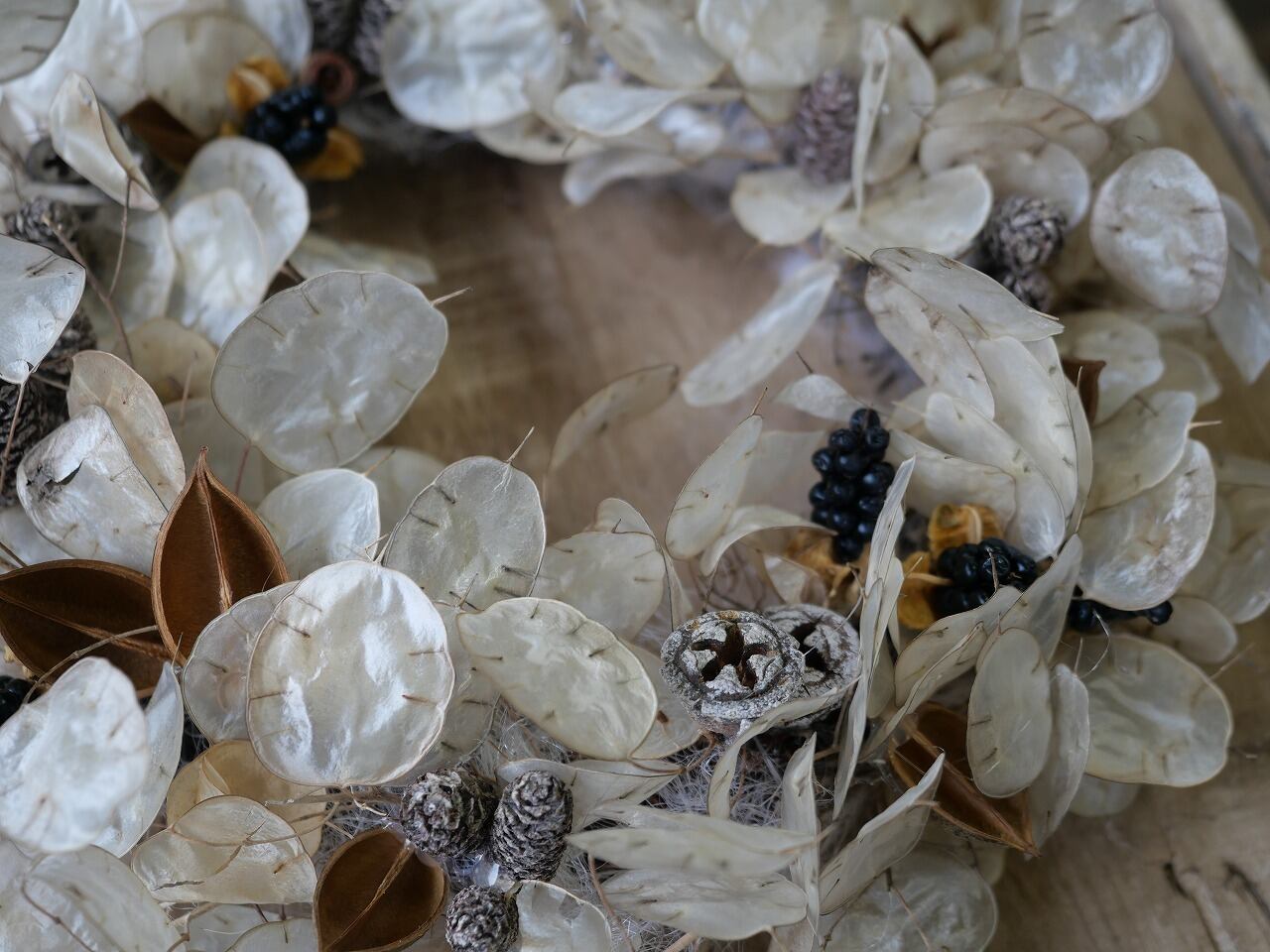 ルナリアをベースにヒオウギの実やユーカリの実などを使ってつくりました。