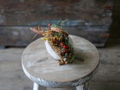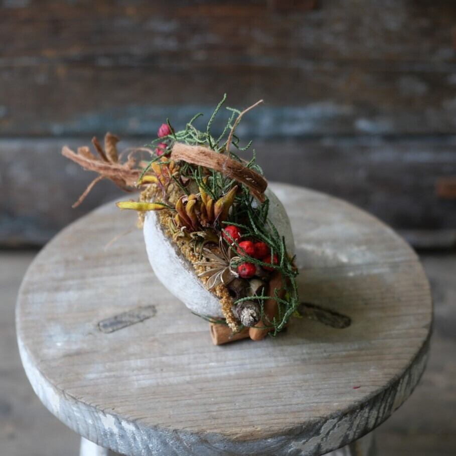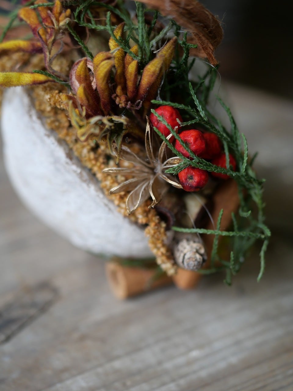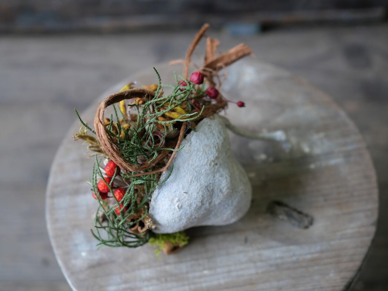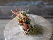 ブラウン系の植物に赤い実やグリーンを使ってアレンジしました。