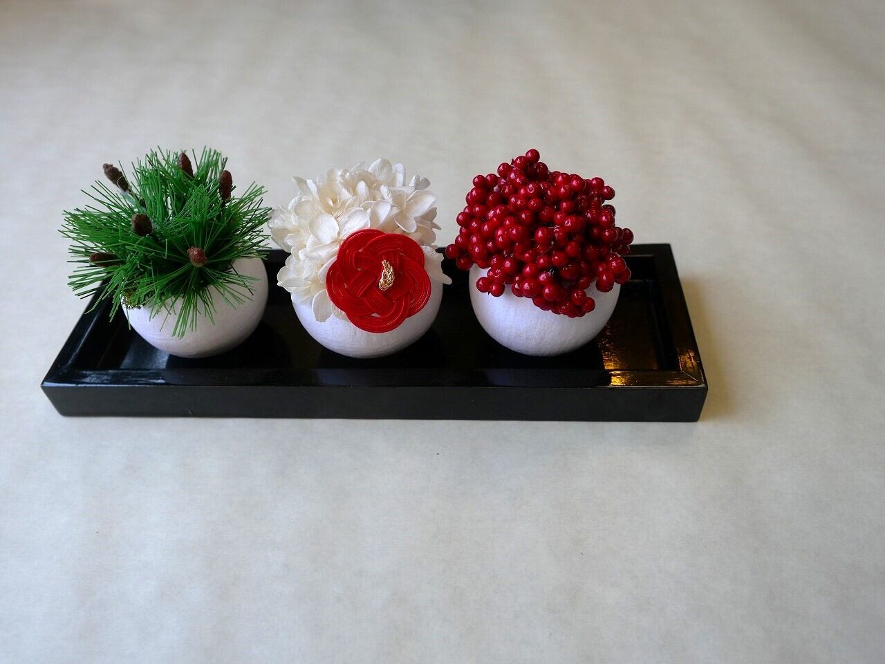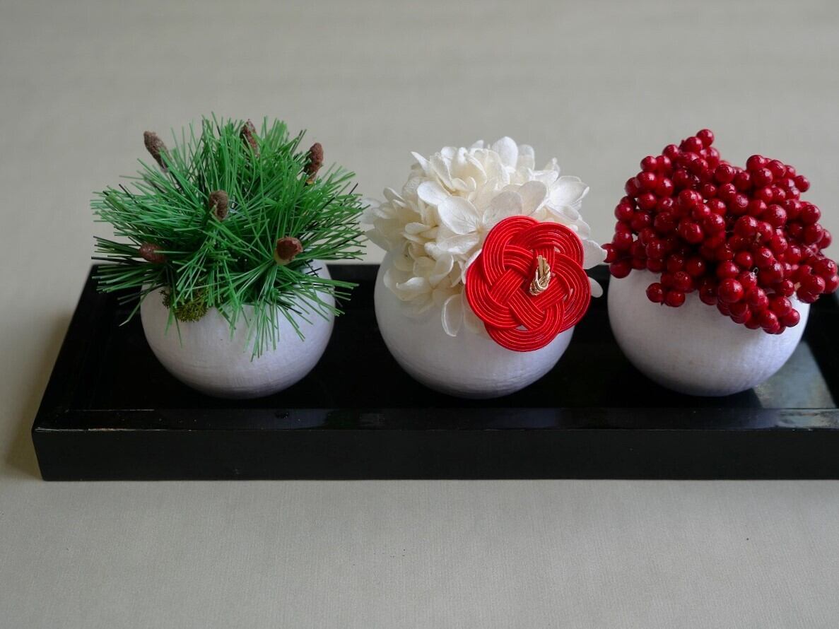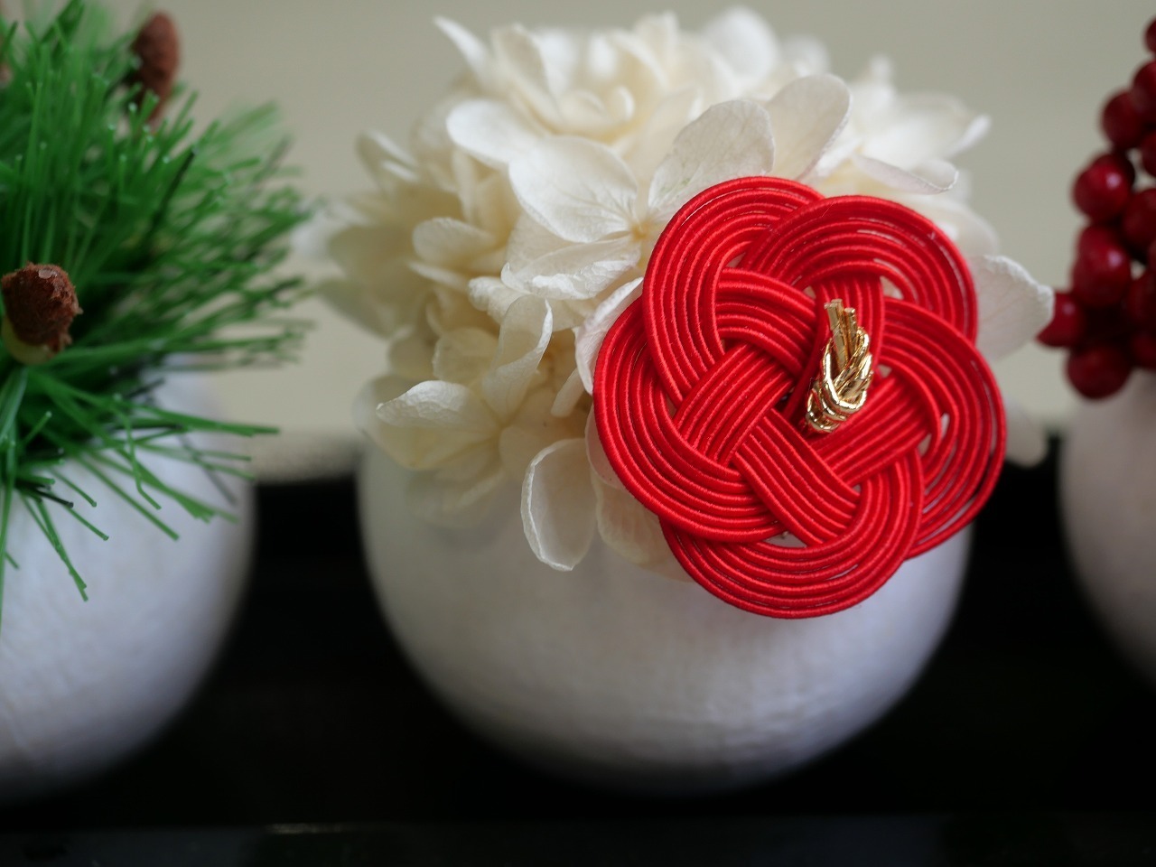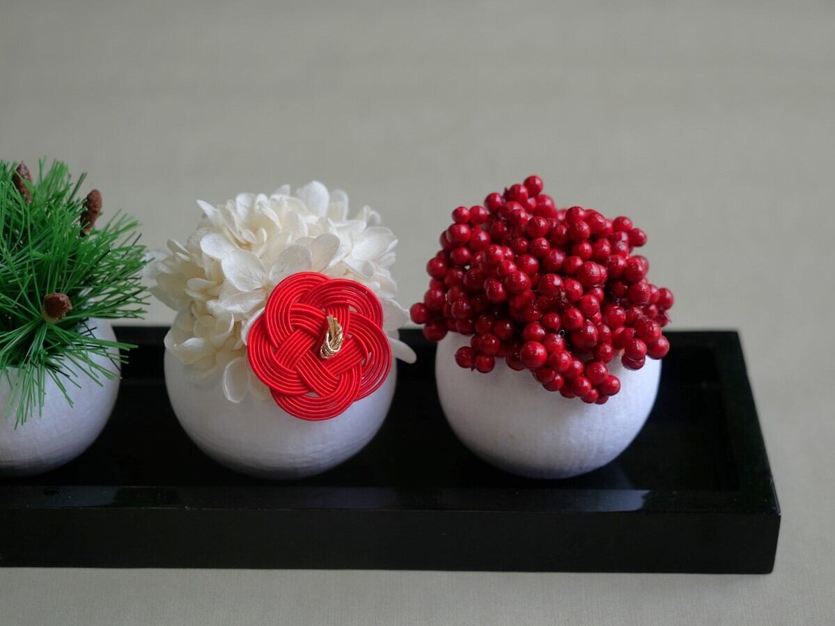 ベルカップという器に赤い実・アジサイ・松をアレンジしています。
