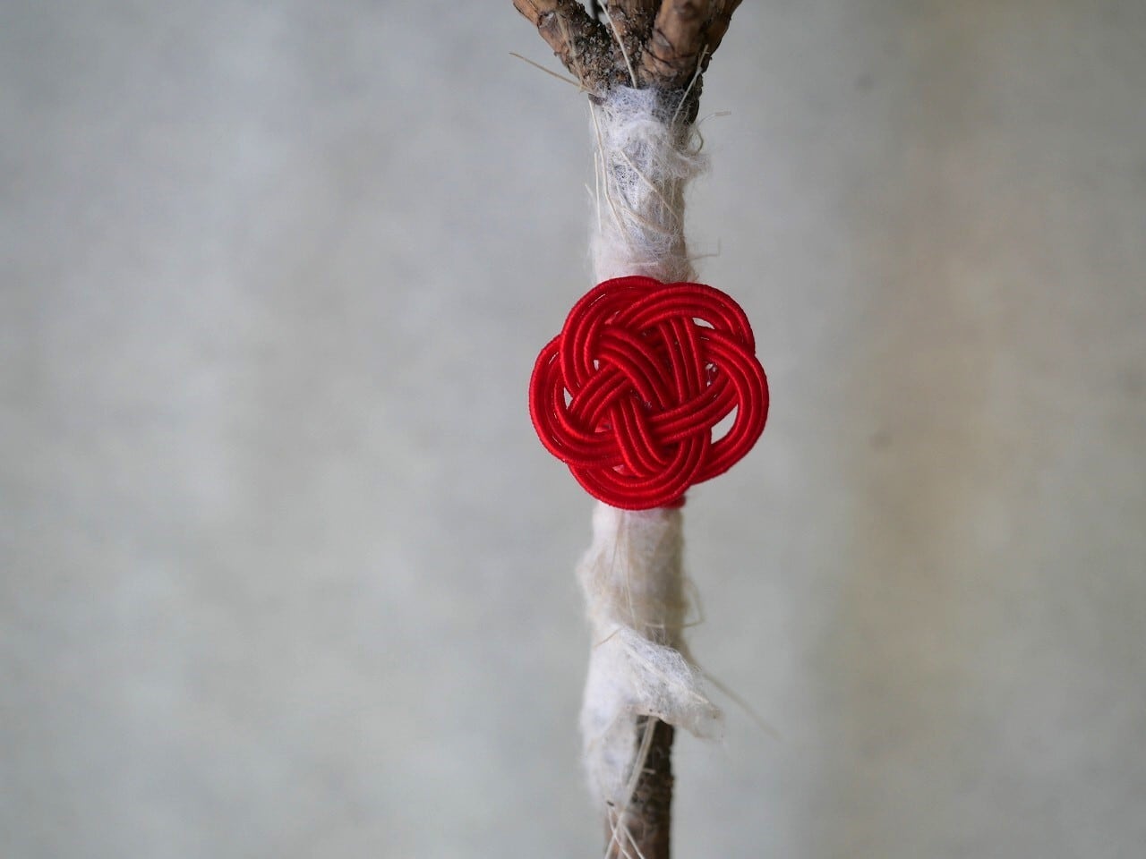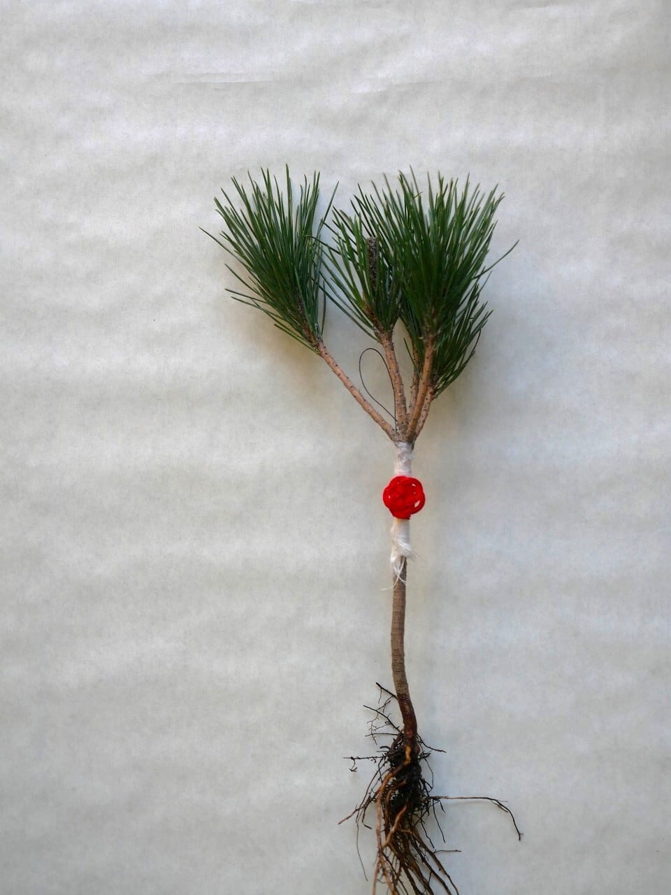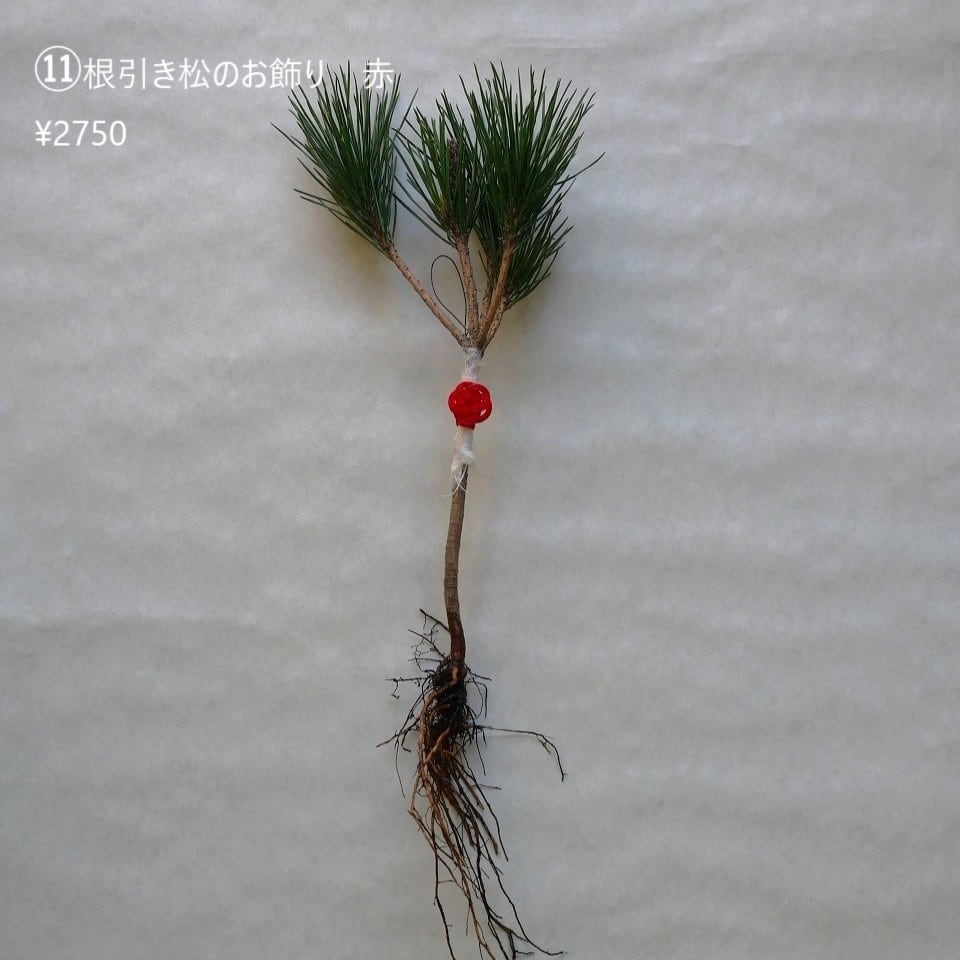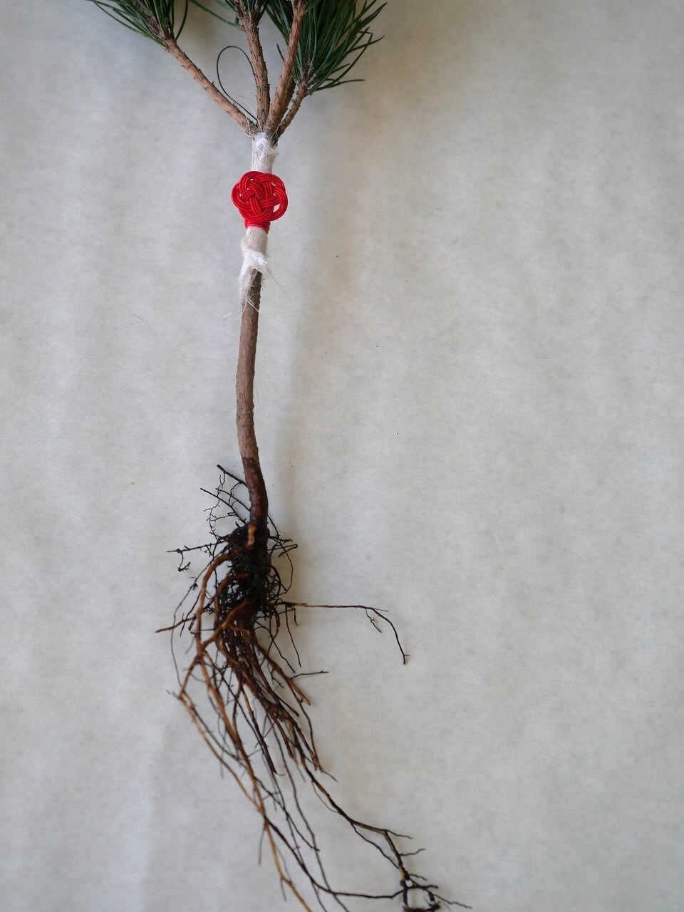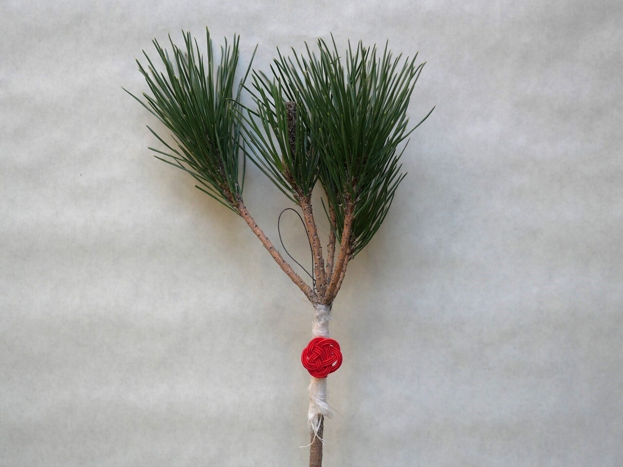 根引き松に赤の梅結びをつけた縦長のお飾りです。